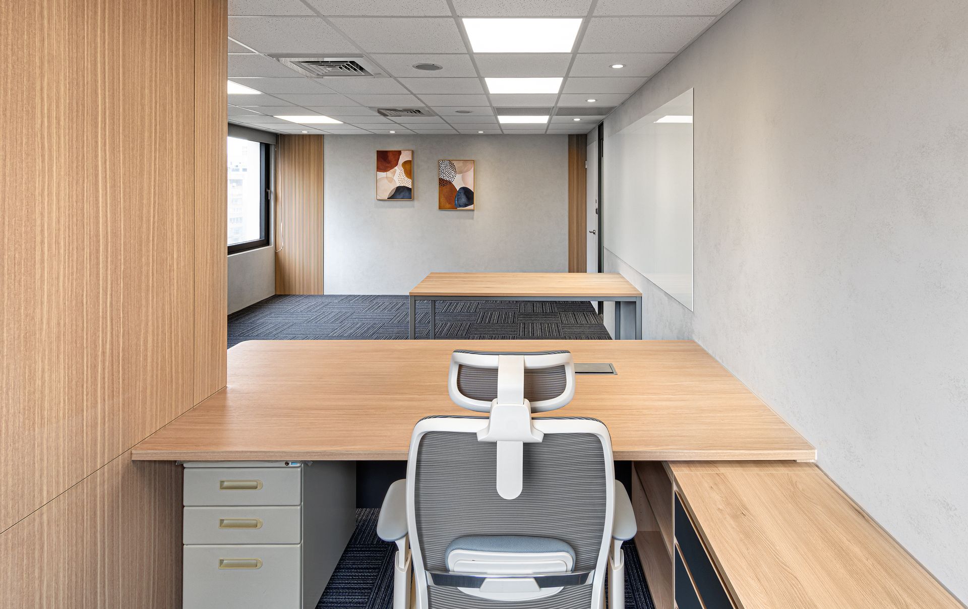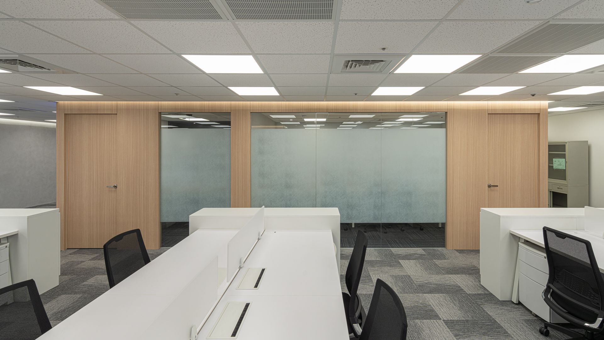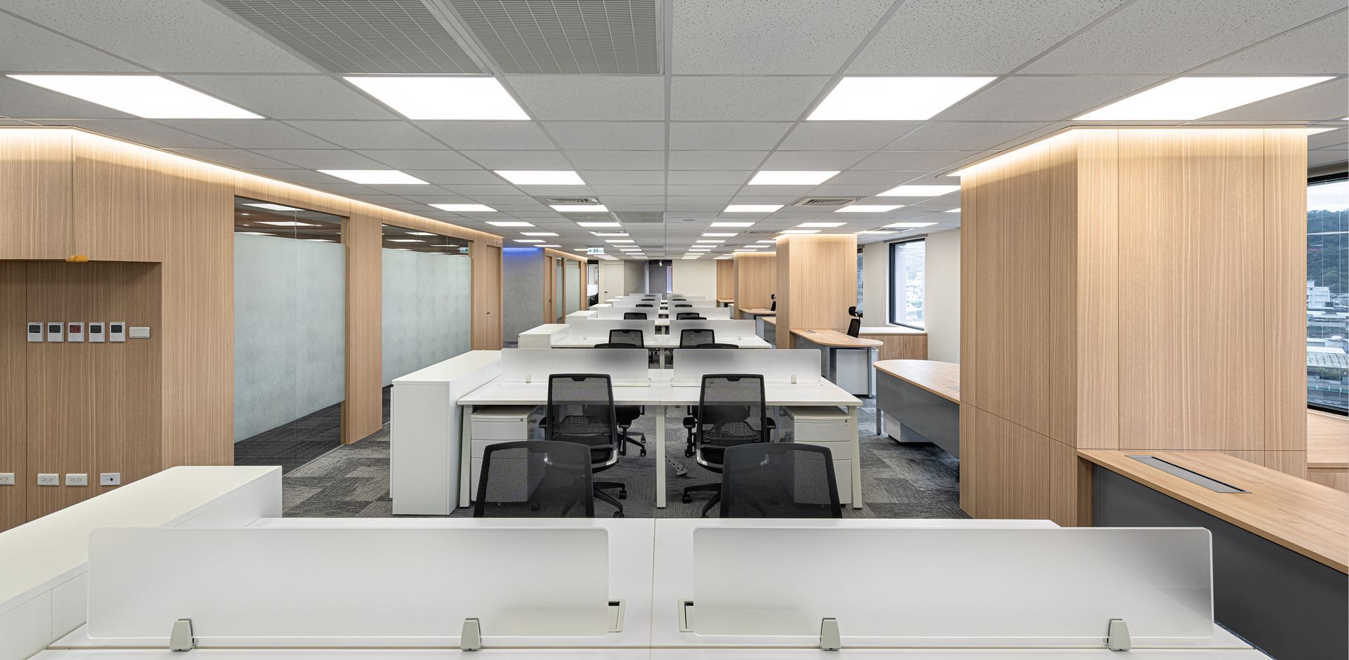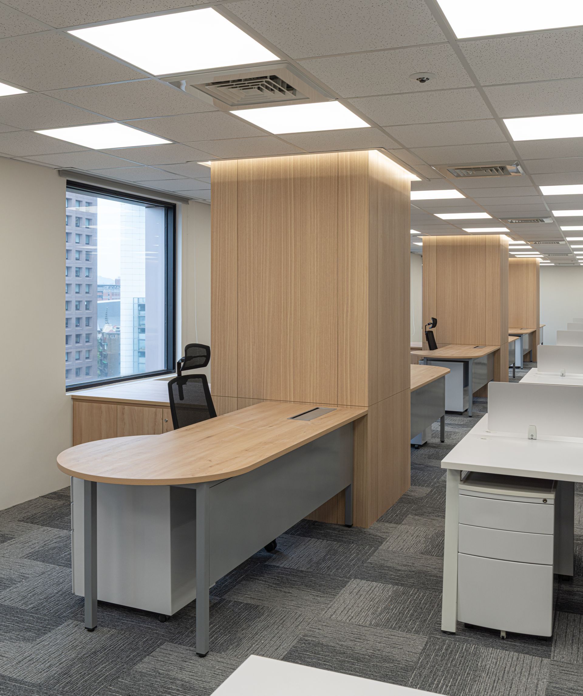 空間依順序主要區分為梯廳、辦公區、會議室及洽談區等,梯廳的天花光帶使壓迫感減低,讓原本狹小的空間達到放大的效果;兩間小會議室的可活動隔屏讓使用上變得更加彈性,形成複合的使用量體增加空間的機動性;員工的辦公領域,承襲自然材質的色調,並让自然光線挹注暖意令人倍感放鬆自在,讓使用者有如徜徉於自然之間安心放鬆。