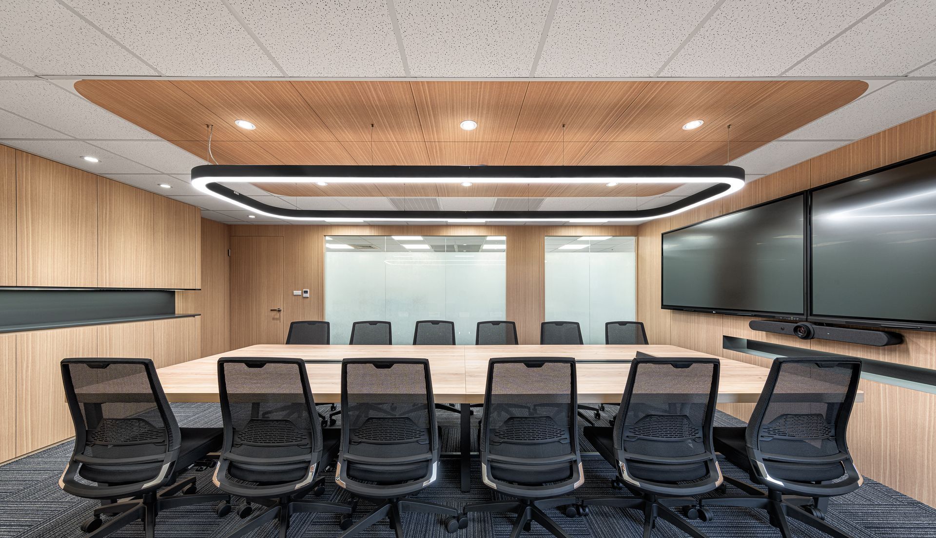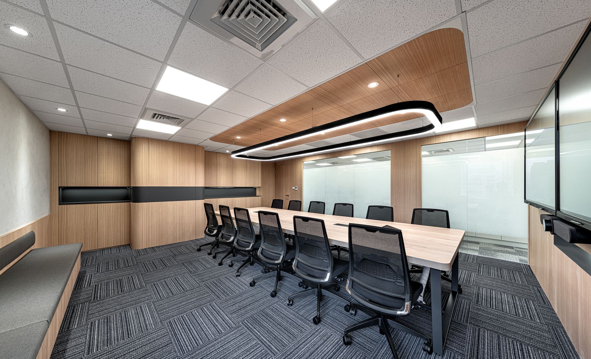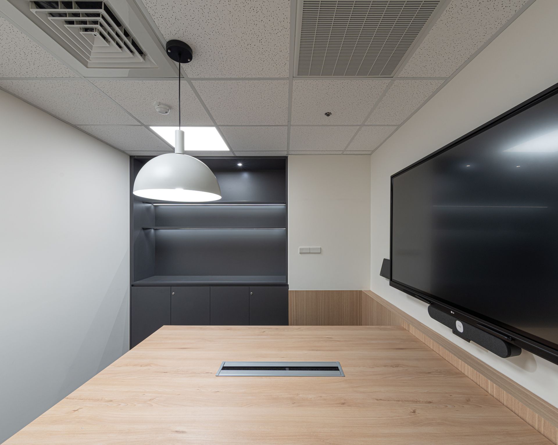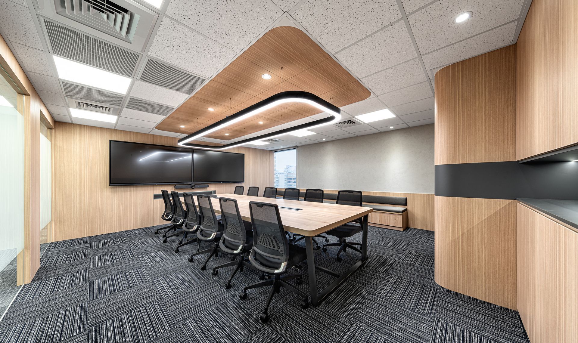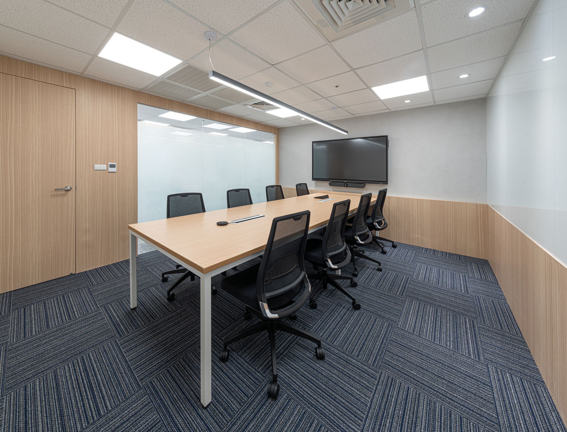 空間依順序主要區分為梯廳、辦公區、會議室及洽談區等,梯廳的天花光帶使壓迫感減低,讓原本狹小的空間達到放大的效果;兩間小會議室的可活動隔屏讓使用上變得更加彈性,形成複合的使用量體增加空間的機動性;員工的辦公領域,承襲自然材質的色調,並让自然光線挹注暖意令人倍感放鬆自在,讓使用者有如徜徉於自然之間安心放鬆。