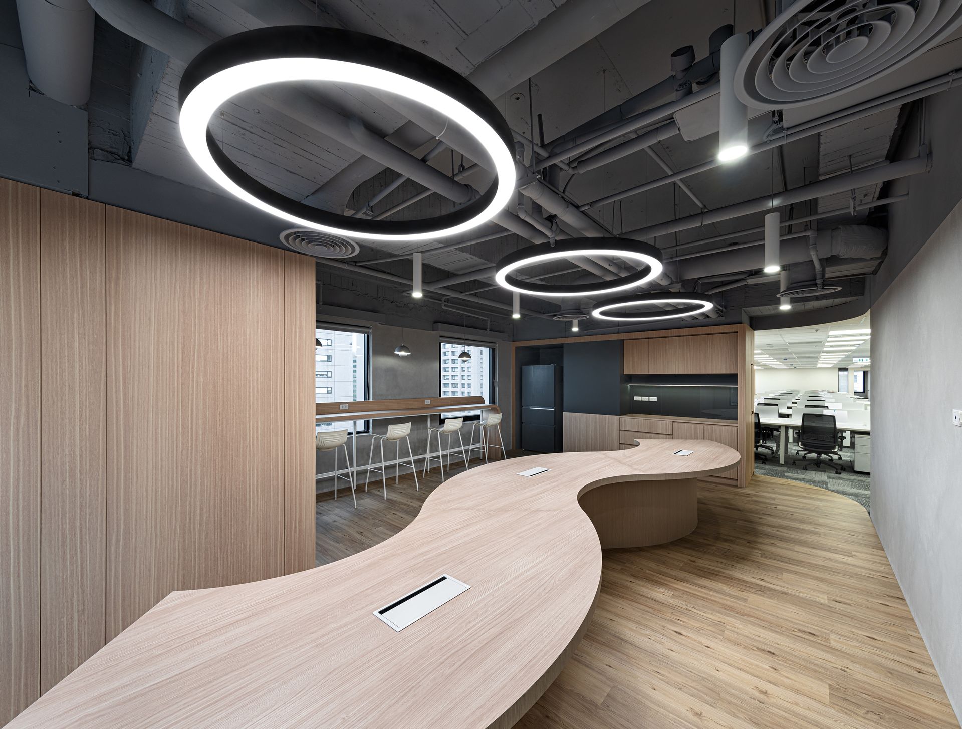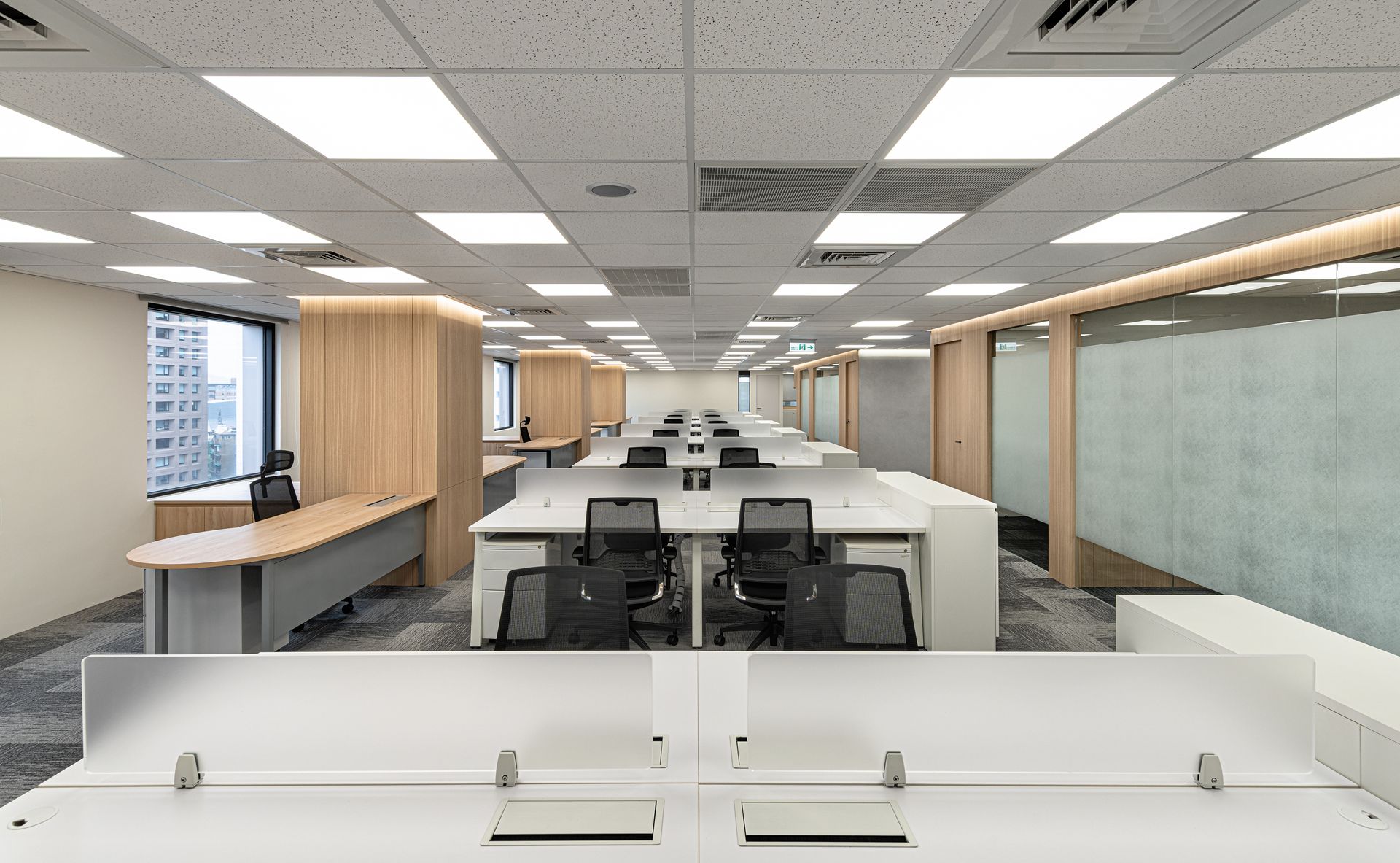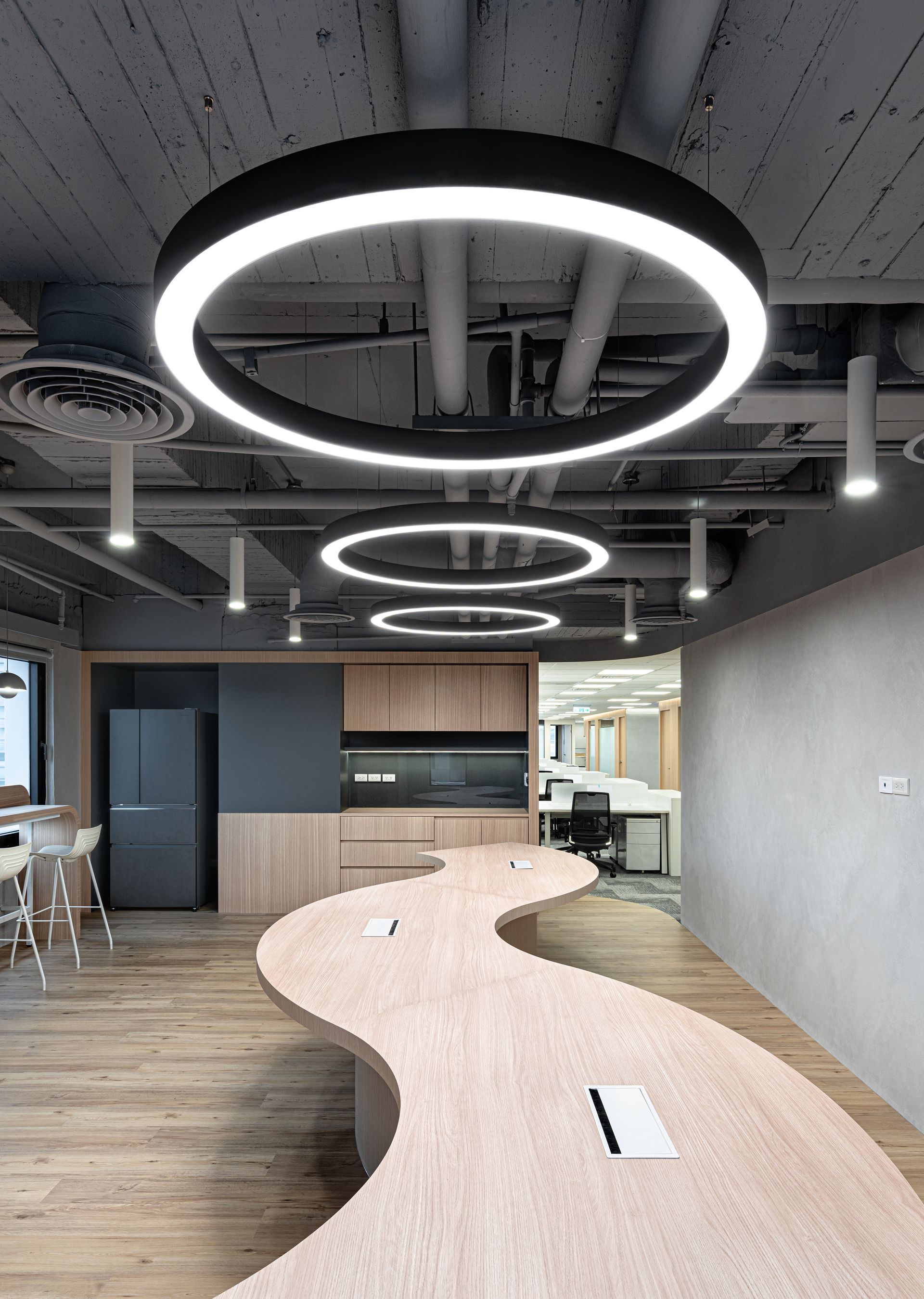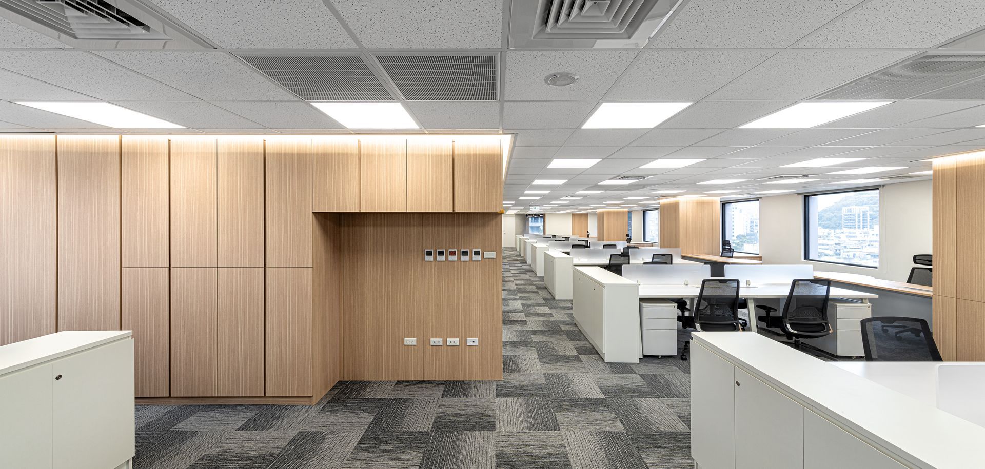 總坪數148坪辦公空間於企業使用,有別於一般的辦公室結構及空間分配,使用地理上的優勢及空間的開放與流動性使動線更加流暢,讓採光度提升,並著重於自然光線於空間的互動性,透過動線、格局、機能的完美分配,打造出理想的辦公空間。