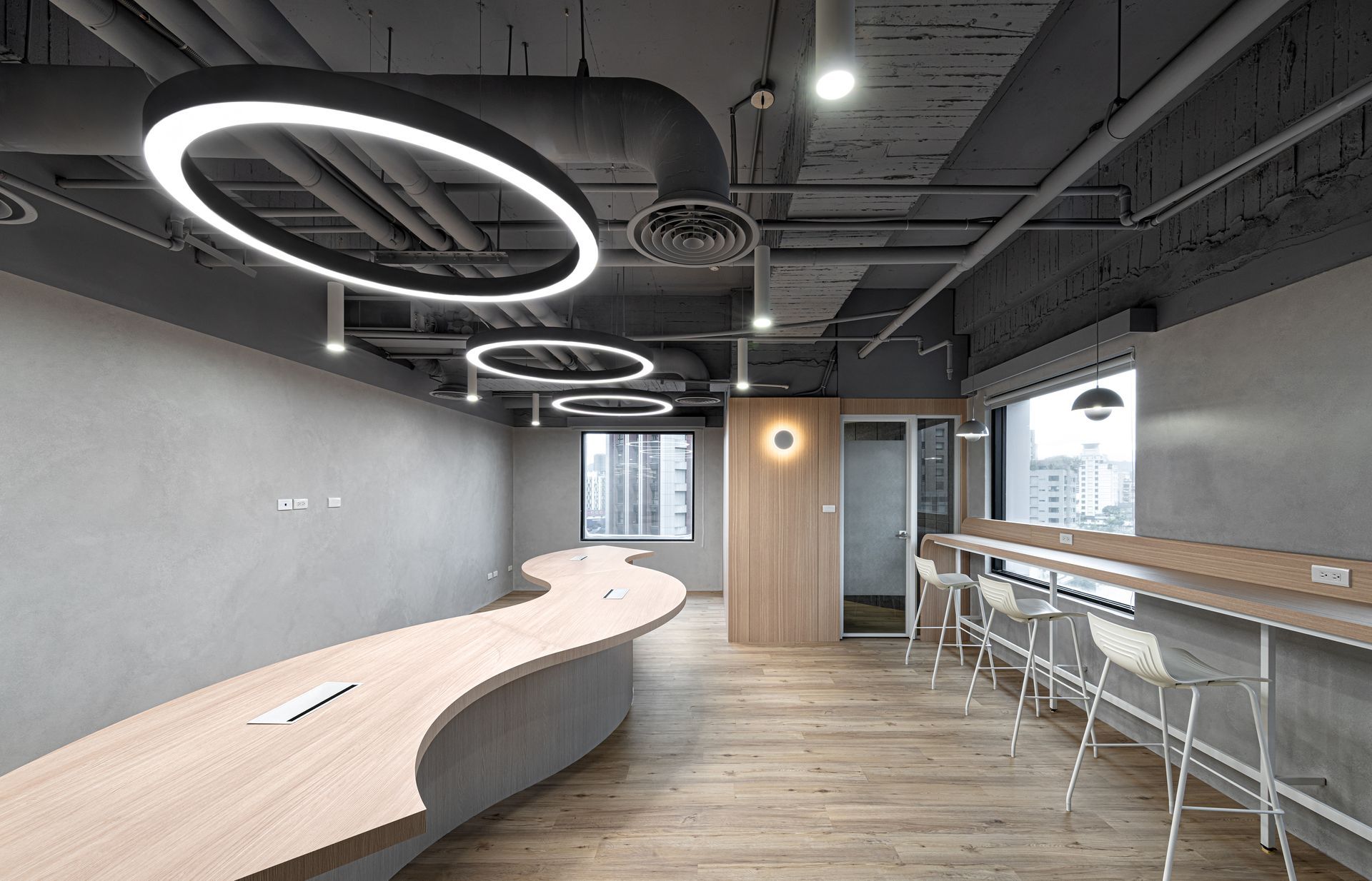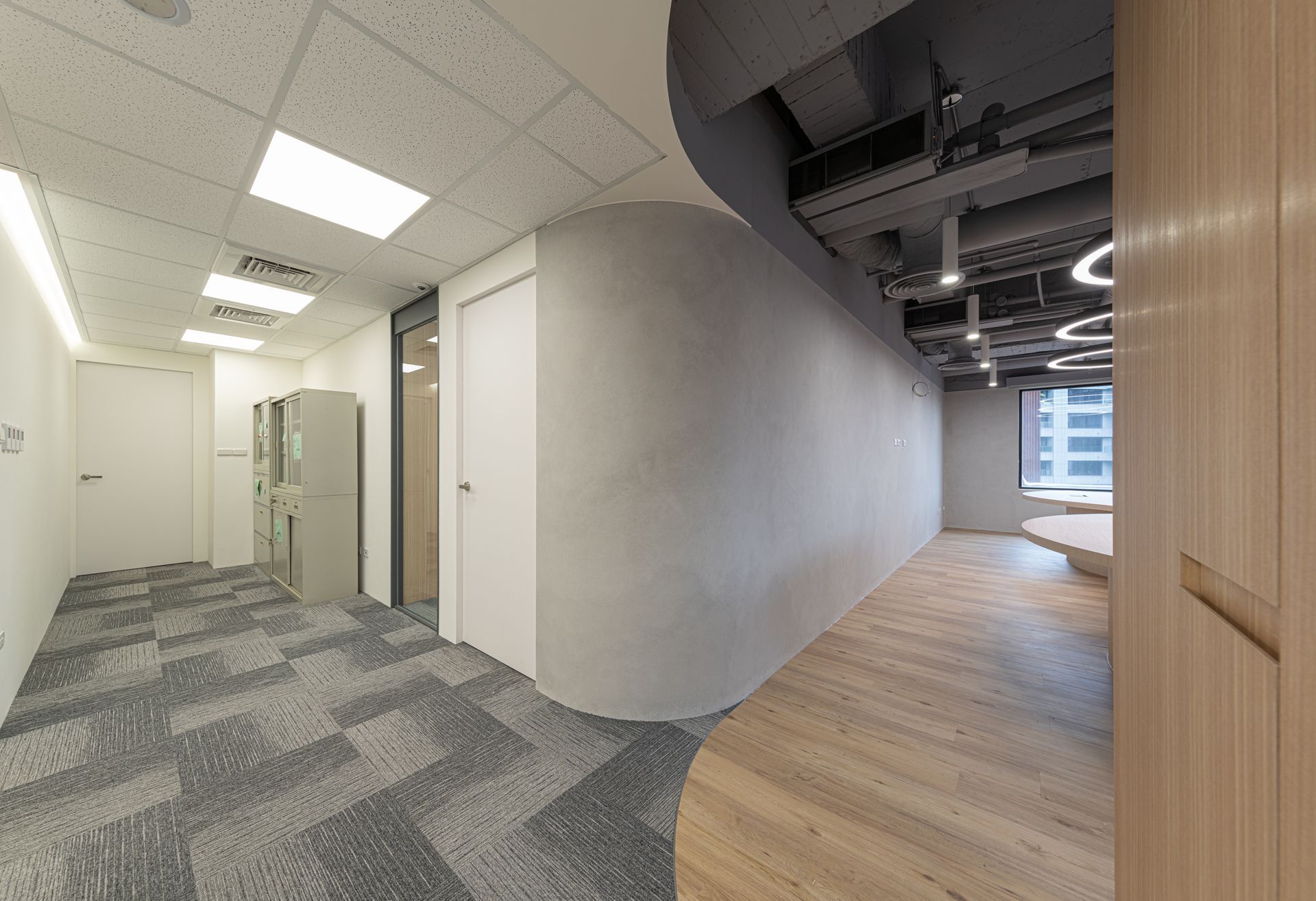 穩重的空間質感作為基礎調性,使用清水模藝術漆面製成的空間量體,搭配木紋的溫暖調和,呈現多元的表現層次,并且刻意裸露的天花樑柱,凸显弧型天花板光帶視覺上的延續,形成空间视觉的延伸感;為了給予空間的開放性格局架構,減少實體牆面的使用,利用透明玻璃、鐵網隔屏的劃分切分辦公區域與會議室,維持光線的穿透及隱私上的控制;另外弧型的玻璃柔化調和轉角處帶給人們的銳利感。