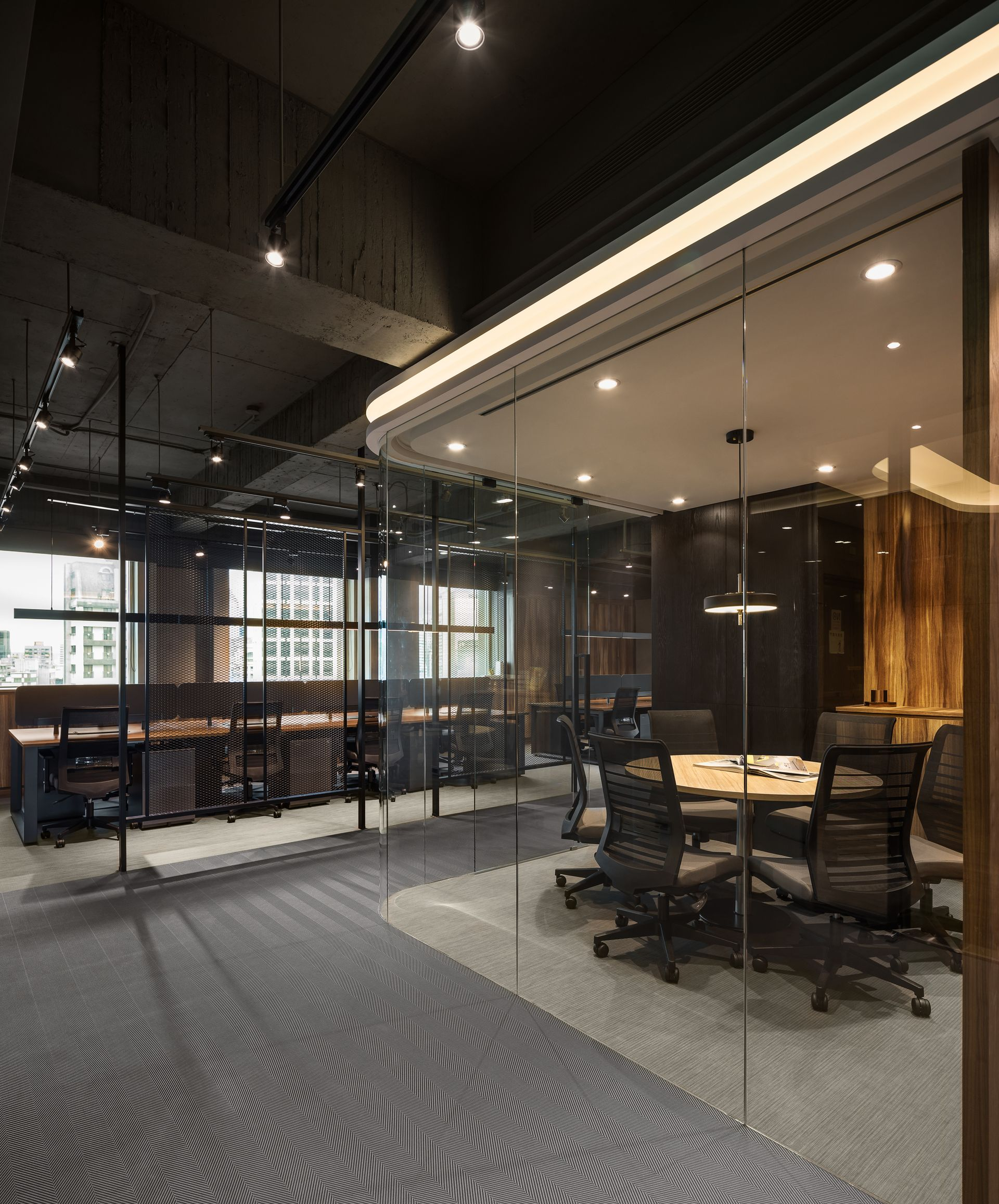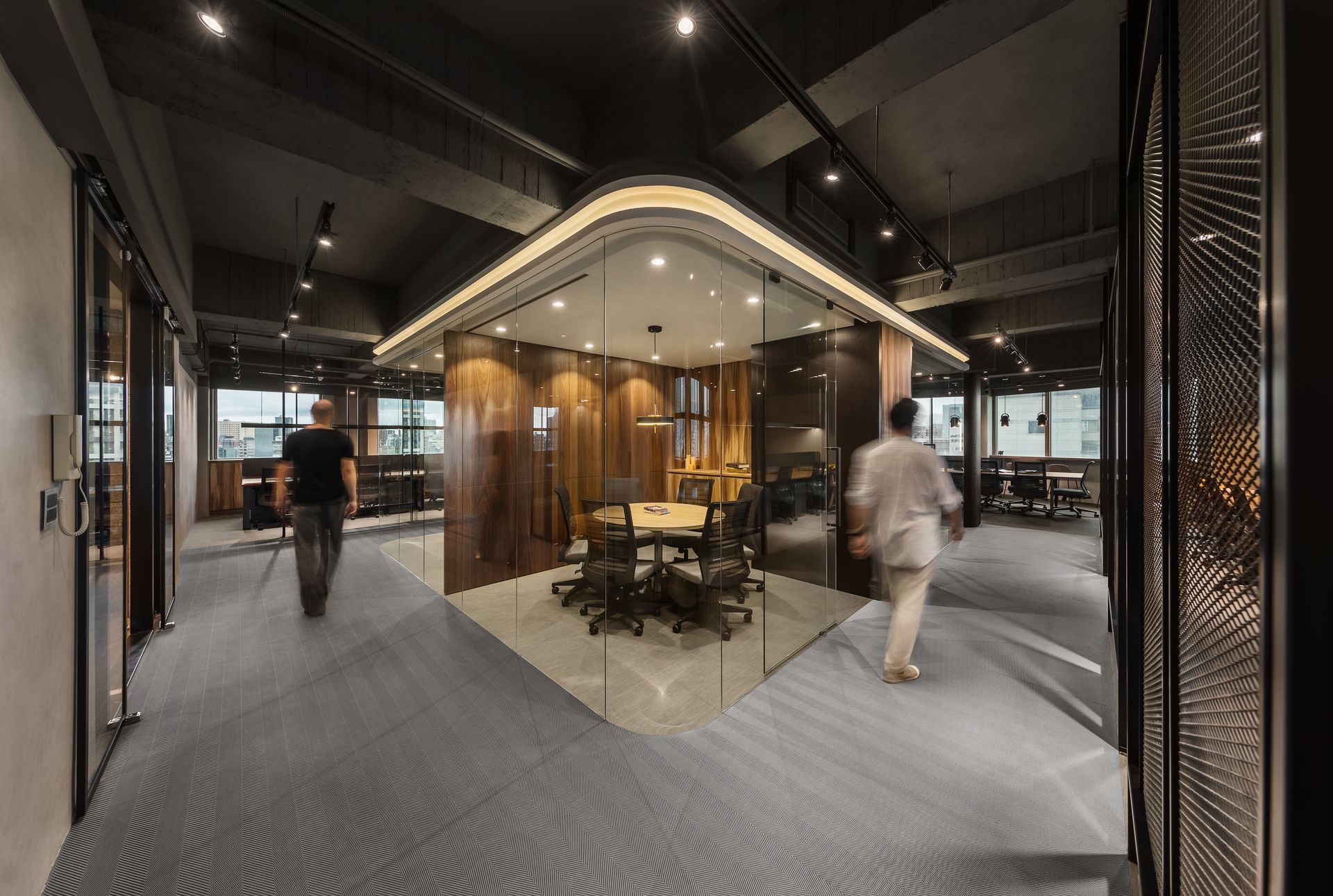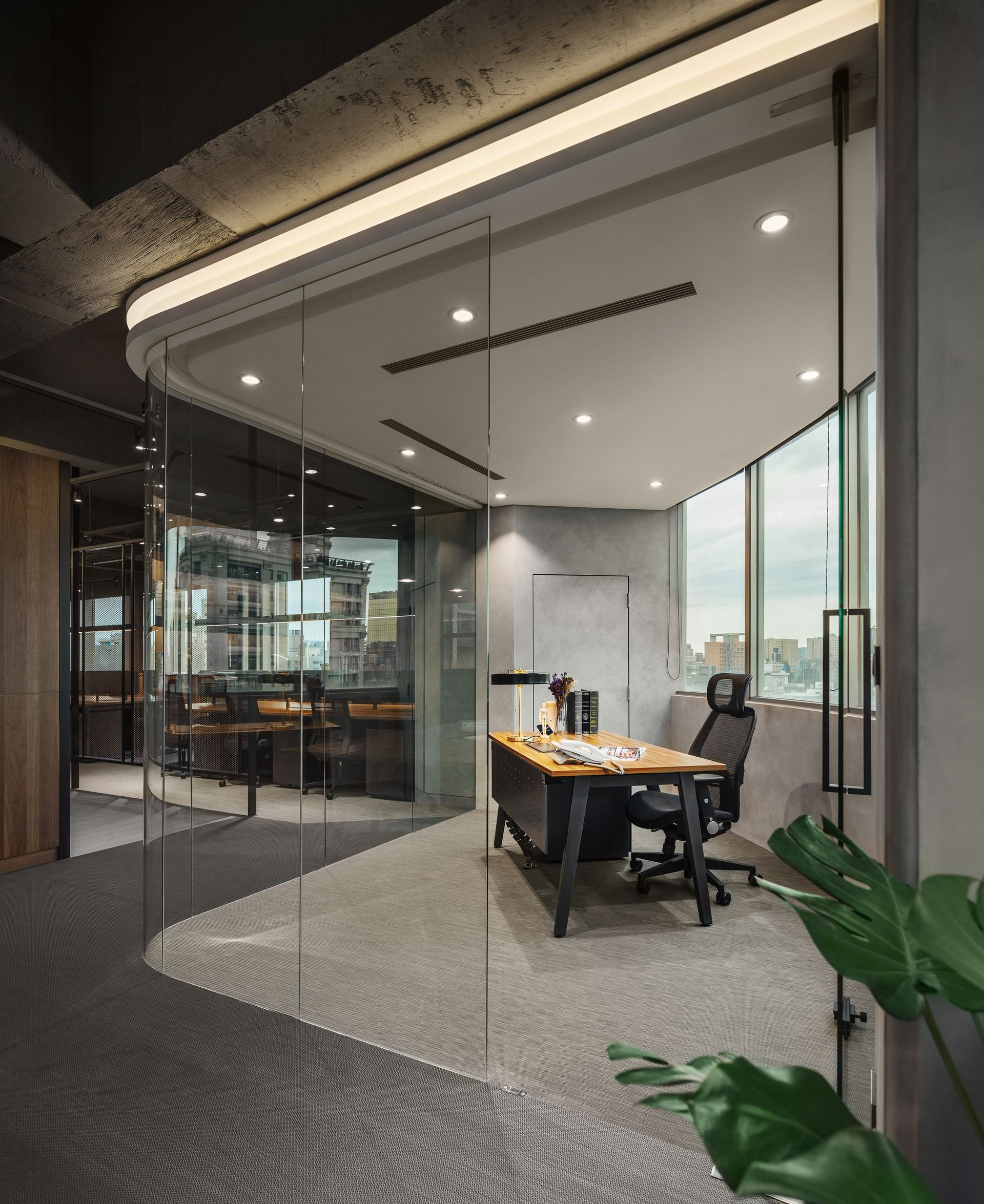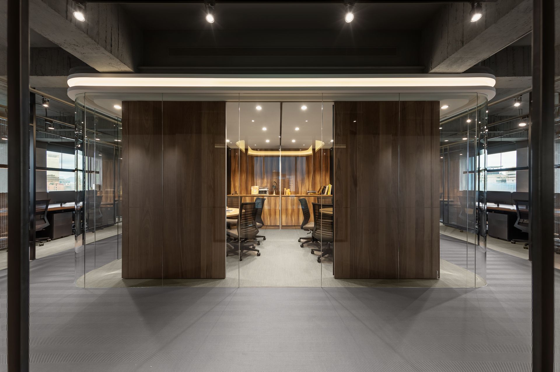 穩重的空間質感作為基礎調性,使用清水模藝術漆面製成的空間量體,搭配木紋的溫暖調和,呈現多元的表現層次,并且刻意裸露的天花樑柱,凸显弧型天花板光帶視覺上的延續,形成空间视觉的延伸感;為了給予空間的開放性格局架構,減少實體牆面的使用,利用透明玻璃、鐵網隔屏的劃分切分辦公區域與會議室,維持光線的穿透及隱私上的控制;另外弧型的玻璃柔化調和轉角處帶給人們的銳利感。