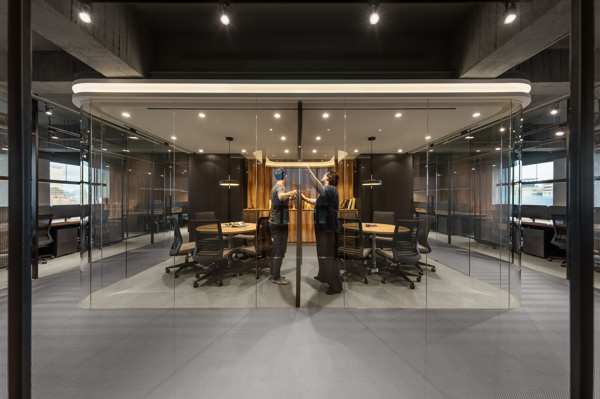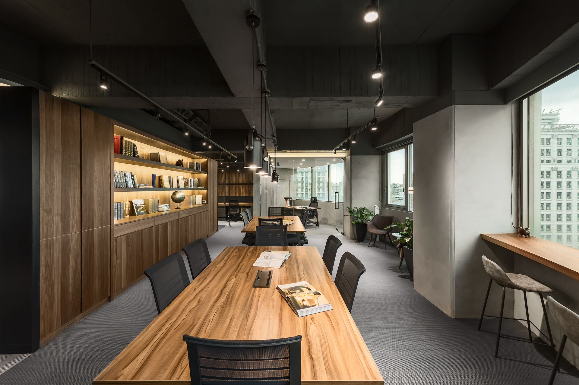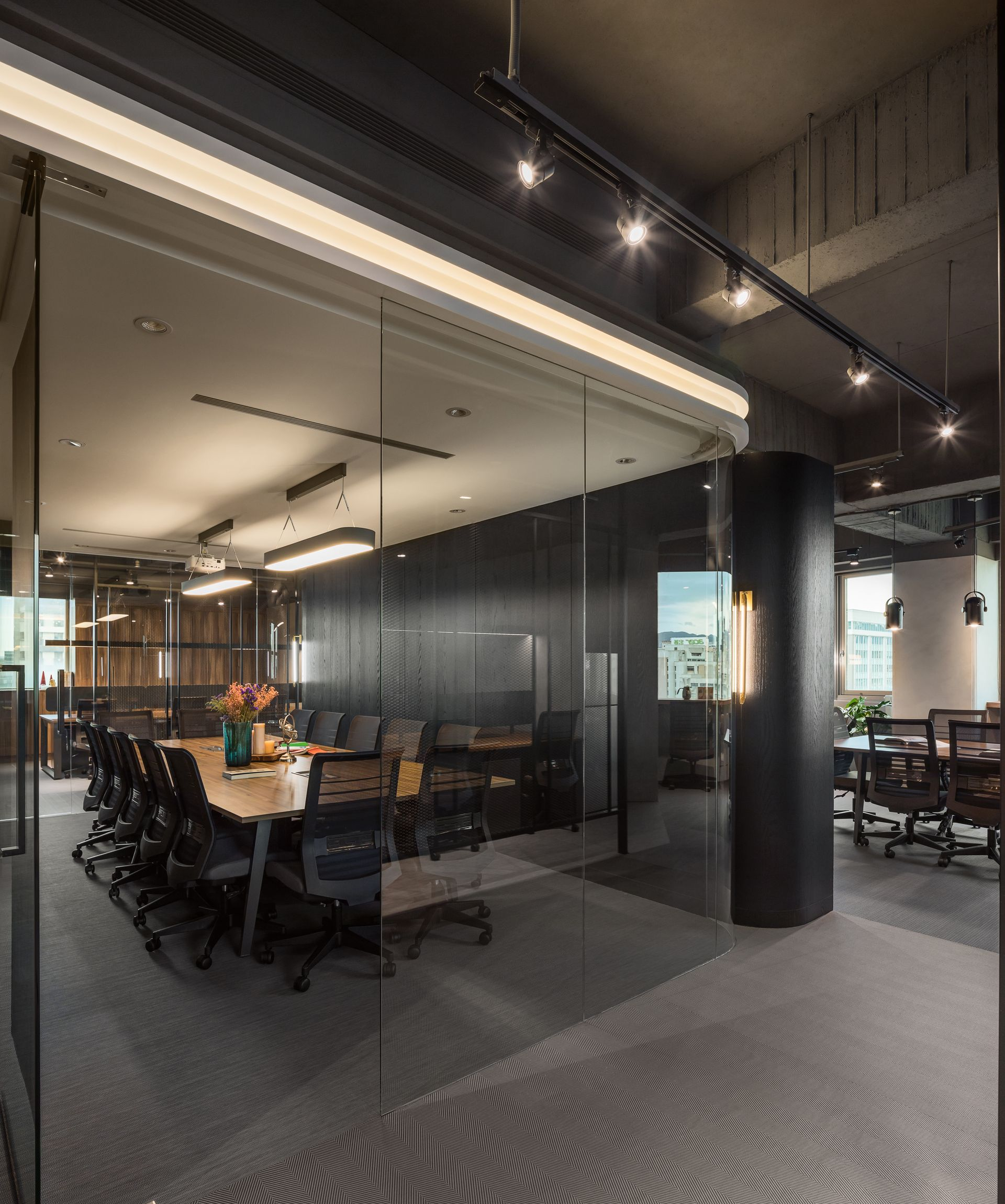 穩重的空間質感作為基礎調性,使用清水模藝術漆面製成的空間量體,搭配木紋的溫暖調和,呈現多元的表現層次,并且刻意裸露的天花樑柱,凸显弧型天花板光帶視覺上的延續,形成空间视觉的延伸感;為了給予空間的開放性格局架構,減少實體牆面的使用,利用透明玻璃、鐵網隔屏的劃分切分辦公區域與會議室,維持光線的穿透及隱私上的控制;另外弧型的玻璃柔化調和轉角處帶給人們的銳利感。