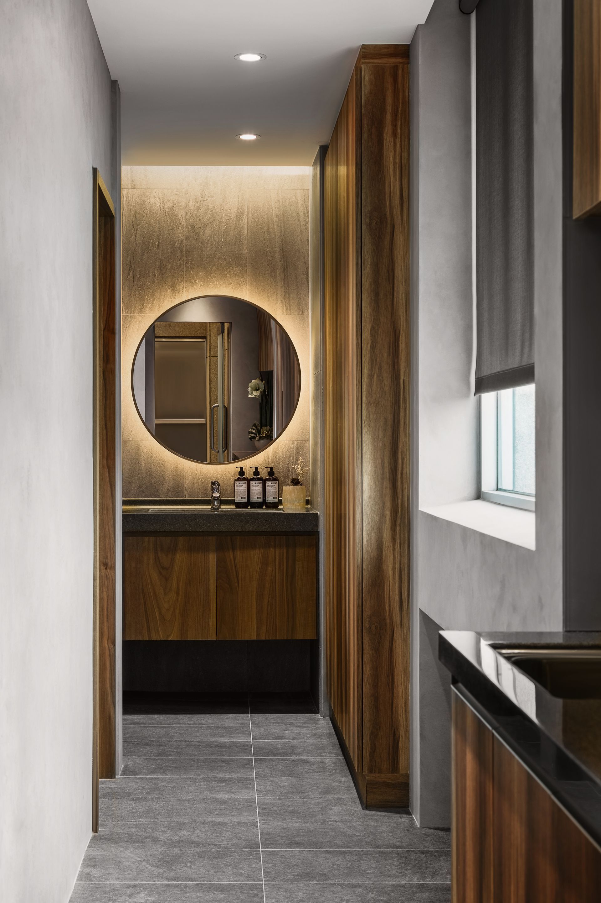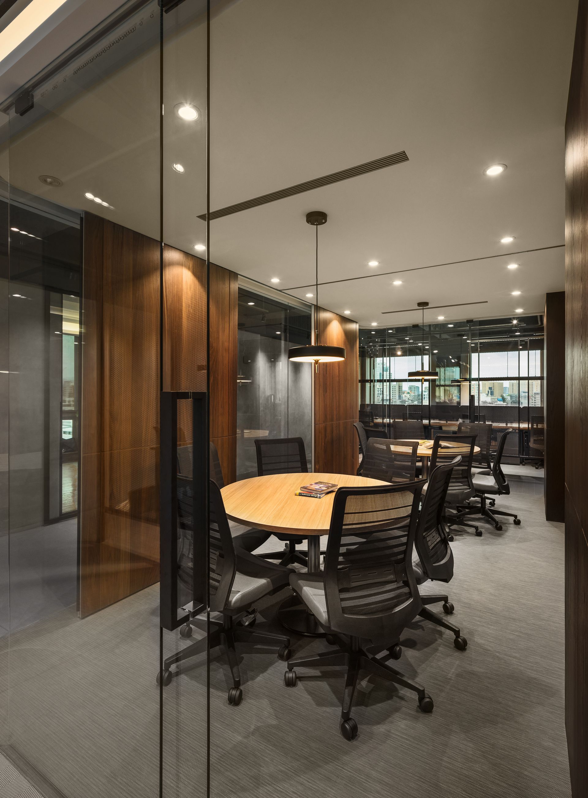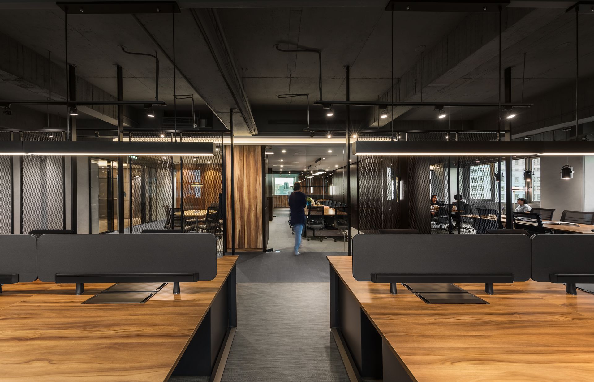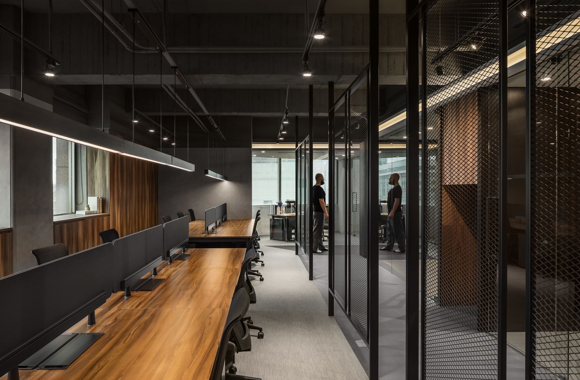 穩重的空間質感作為基礎調性,使用清水模藝術漆面製成的空間量體,搭配木紋的溫暖調和,呈現多元的表現層次,并且刻意裸露的天花樑柱,凸显弧型天花板光帶視覺上的延續,形成空间视觉的延伸感;為了給予空間的開放性格局架構,減少實體牆面的使用,利用透明玻璃、鐵網隔屏的劃分切分辦公區域與會議室,維持光線的穿透及隱私上的控制;另外弧型的玻璃柔化調和轉角處帶給人們的銳利感。