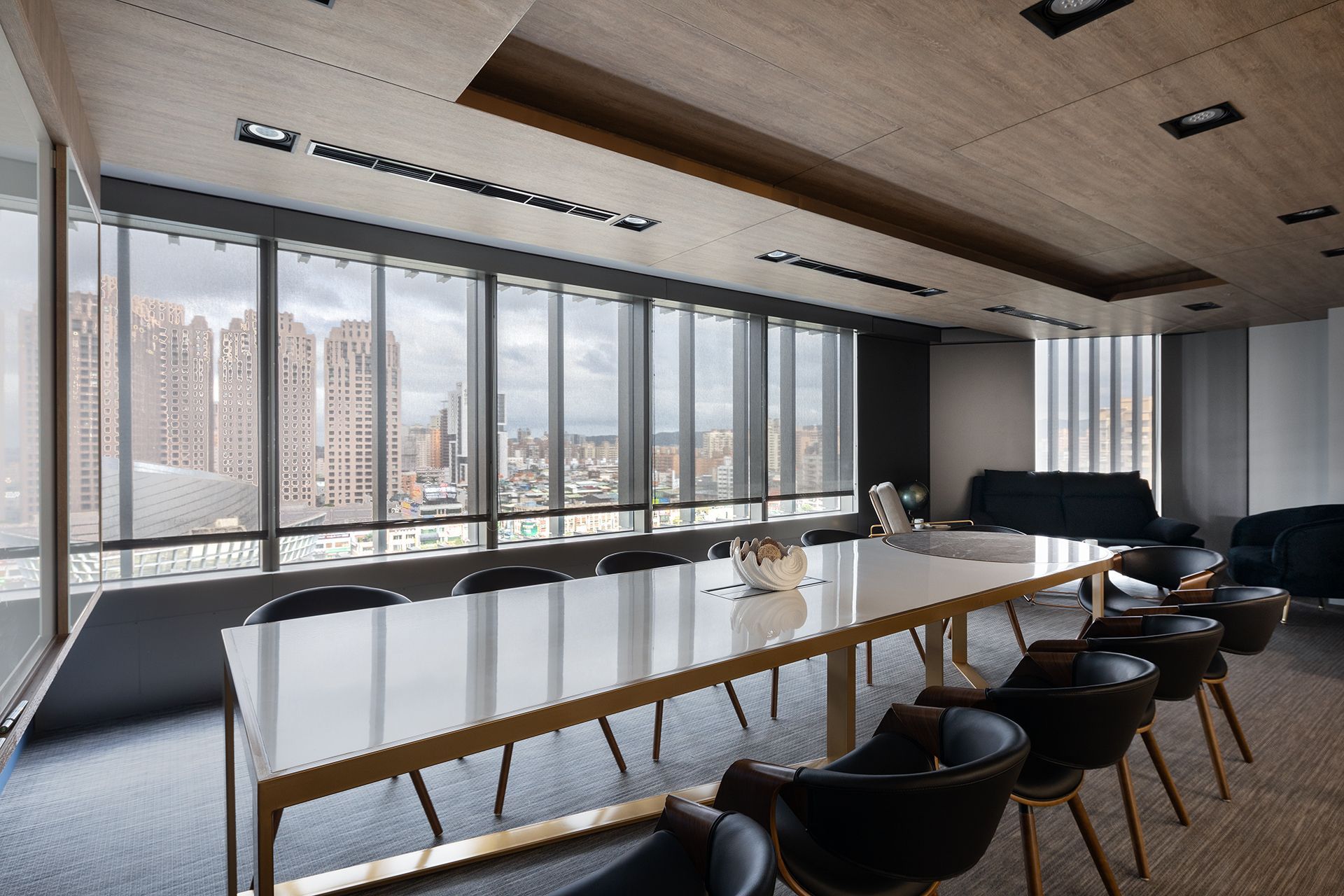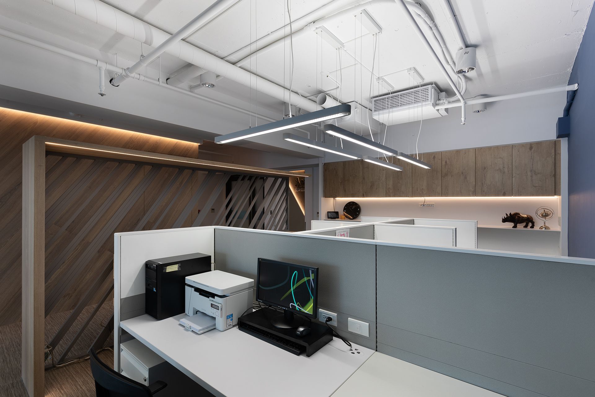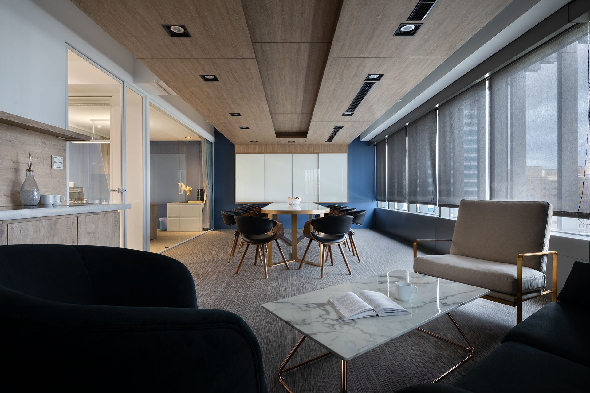 識別度的設定,是一家企業的門面,要讓這印象一進門就深植,就必須考量公司的產品特性,因此選定易親近的木質調,連貫著LOGO主牆以及儲藏室外牆;另外在能一眼望盡的狹長牆面,刷上企業色藍灰,結合企業形象與室內設計。從入口貫穿到最裡面的會議室,除了藍灰牆面,另外就是木質調的重複運用,用來呼應入口的木質牆面,是會議室的木質天花板。會議室設定,除了可容納12人會議桌,還有一個沙發休憩區及茶水區,既正式又休閒,在會議時不會有壓迫感,在休憩時不至於過於放鬆。