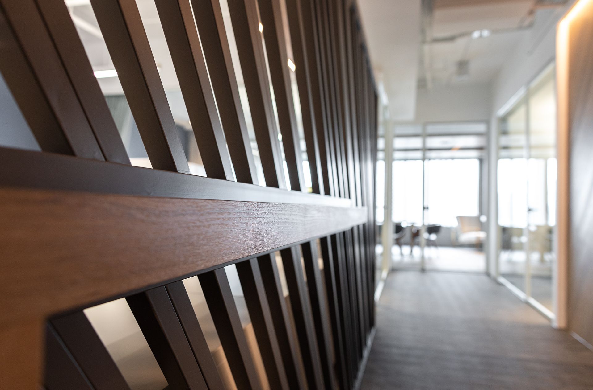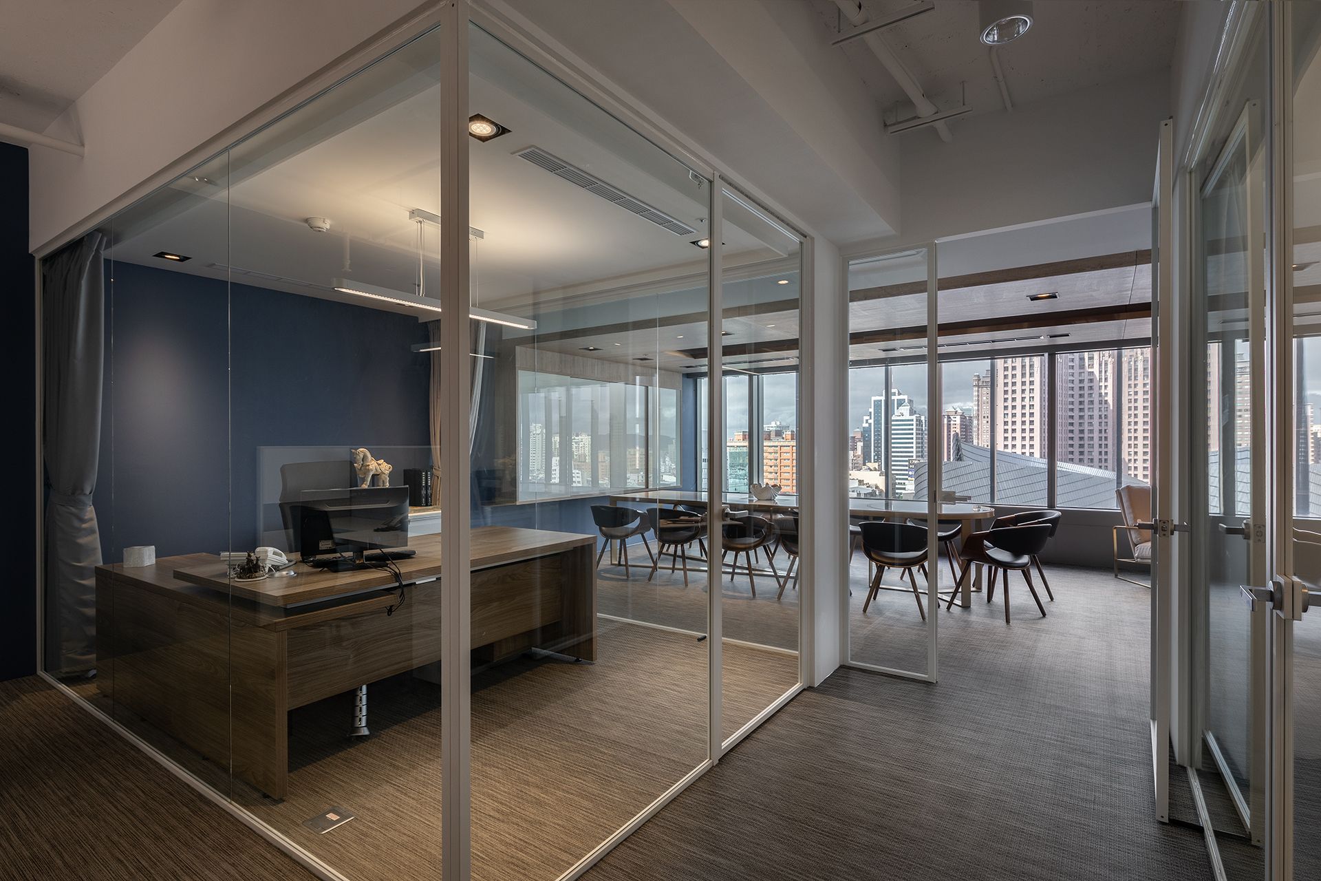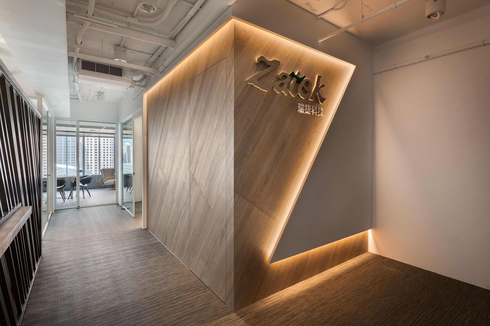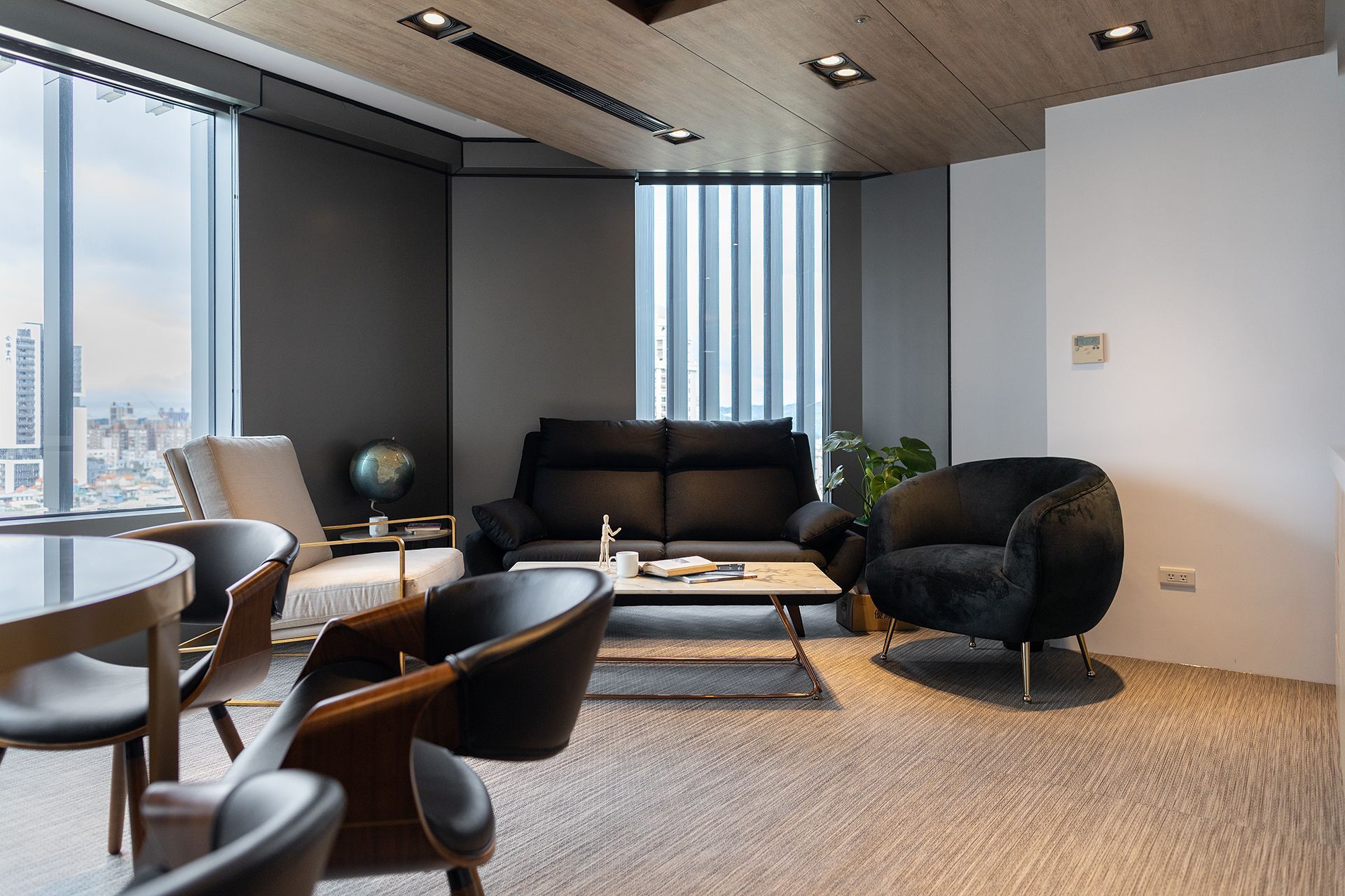 識別度的設定,是一家企業的門面,要讓這印象一進門就深植,就必須考量公司的產品特性,因此選定易親近的木質調,連貫著LOGO主牆以及儲藏室外牆;另外在能一眼望盡的狹長牆面,刷上企業色藍灰,結合企業形象與室內設計。從入口貫穿到最裡面的會議室,除了藍灰牆面,另外就是木質調的重複運用,用來呼應入口的木質牆面,是會議室的木質天花板。會議室設定,除了可容納12人會議桌,還有一個沙發休憩區及茶水區,既正式又休閒,在會議時不會有壓迫感,在休憩時不至於過於放鬆。