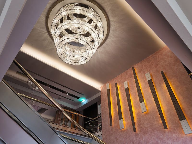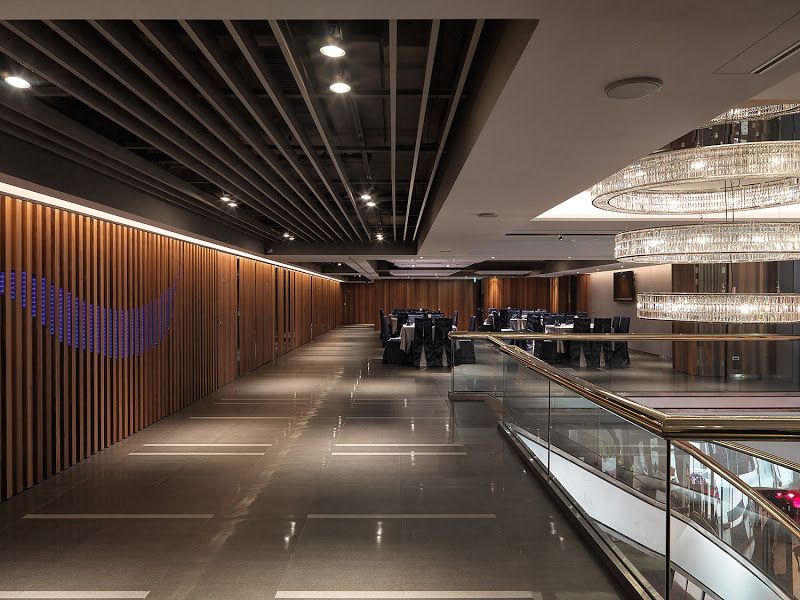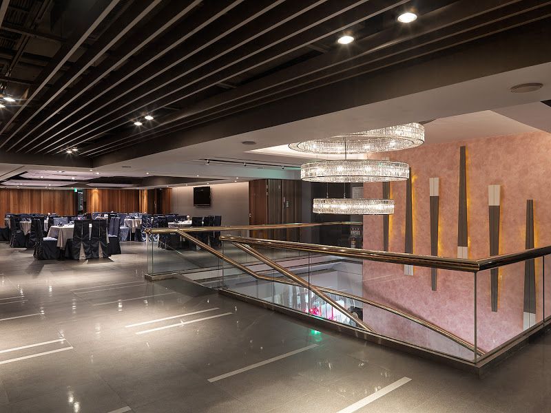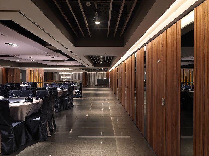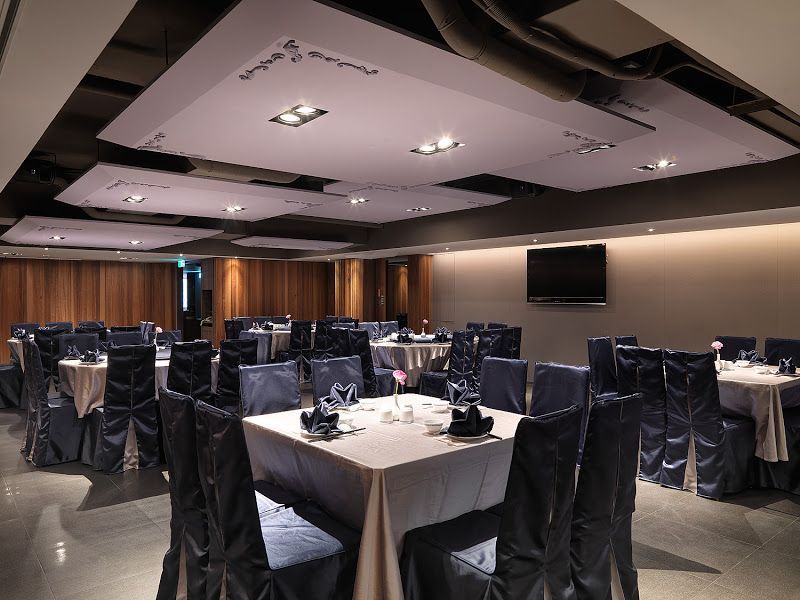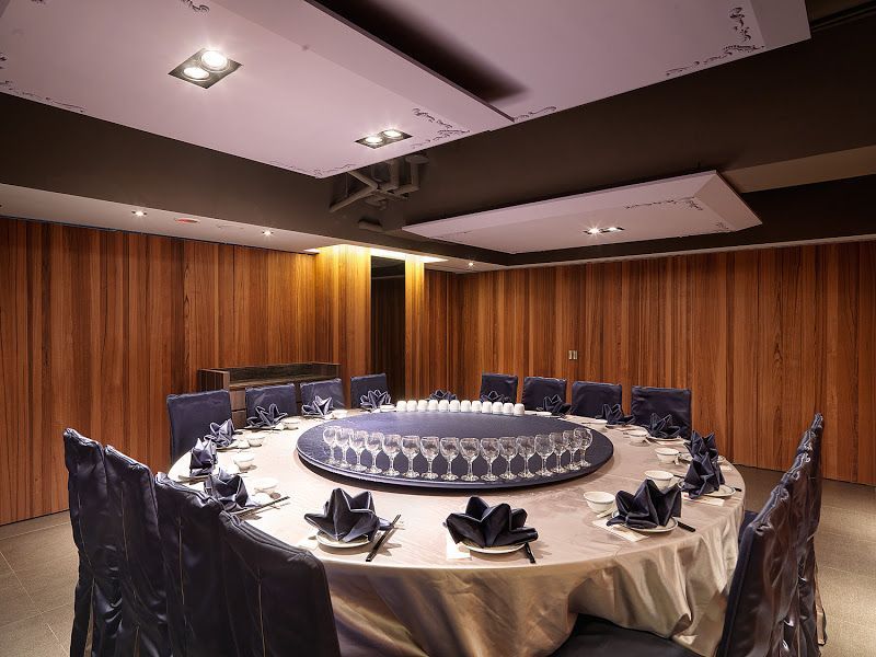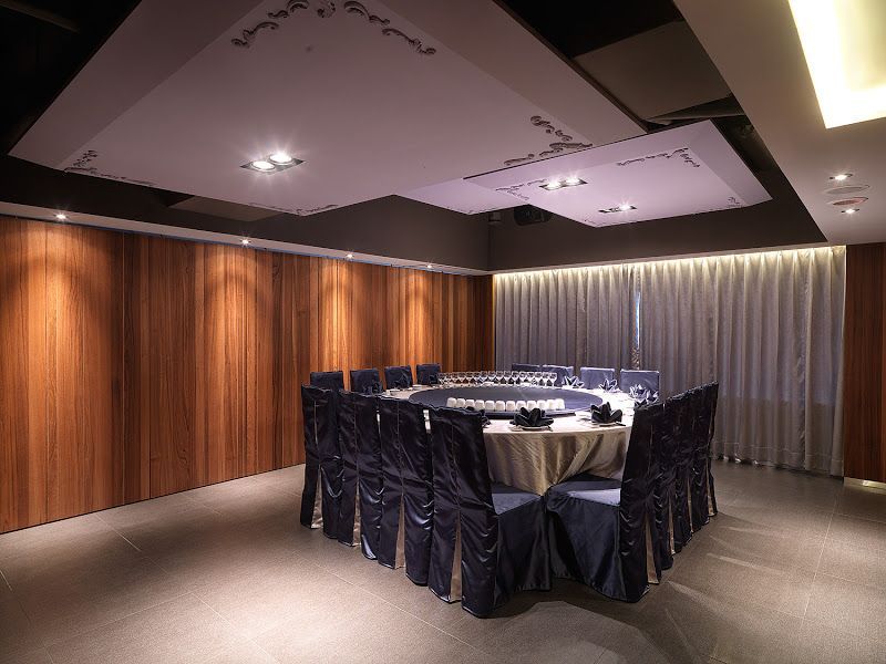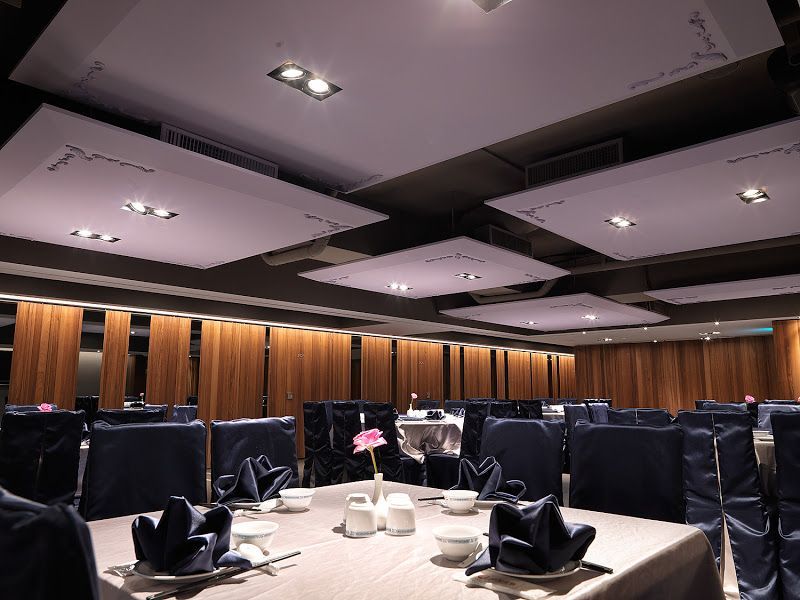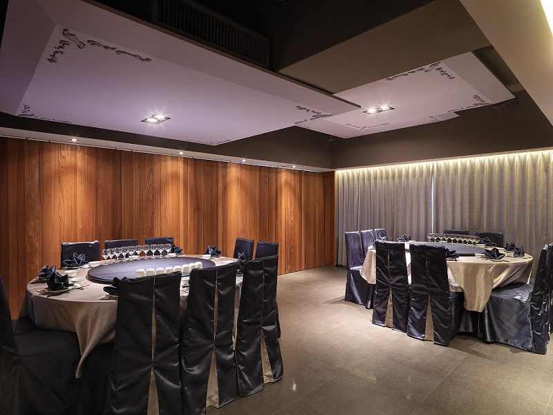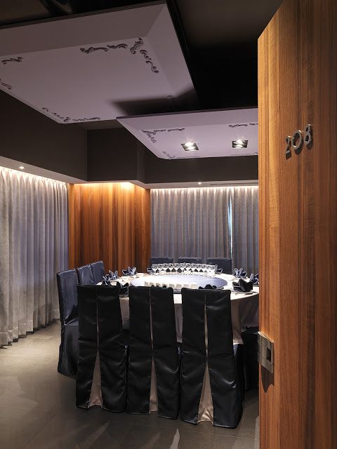 黑玻的深,收邊的醇厚鐵灰,格柵後洗牆的淺灰,露明天花的白灰,窯變紋路的亮灰,卡座的紫灰,堆砌後為之一亮的是格柵的粉紫,帶來溫度的是白栓木紋,於天於壁,突顯回歸桌上,那些紅的白的,綠的澄的艷麗菜色。