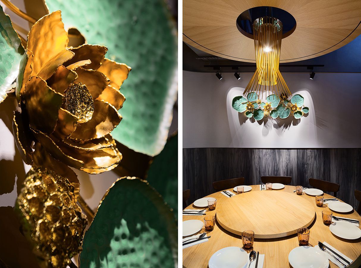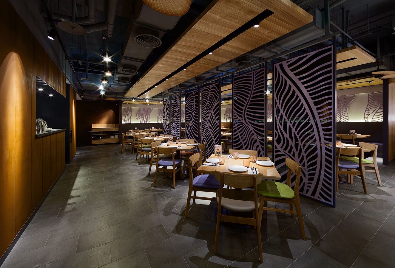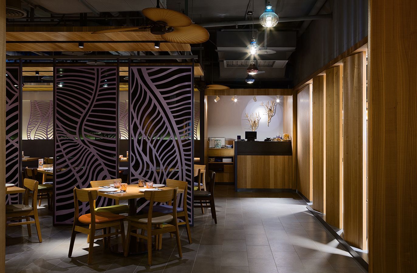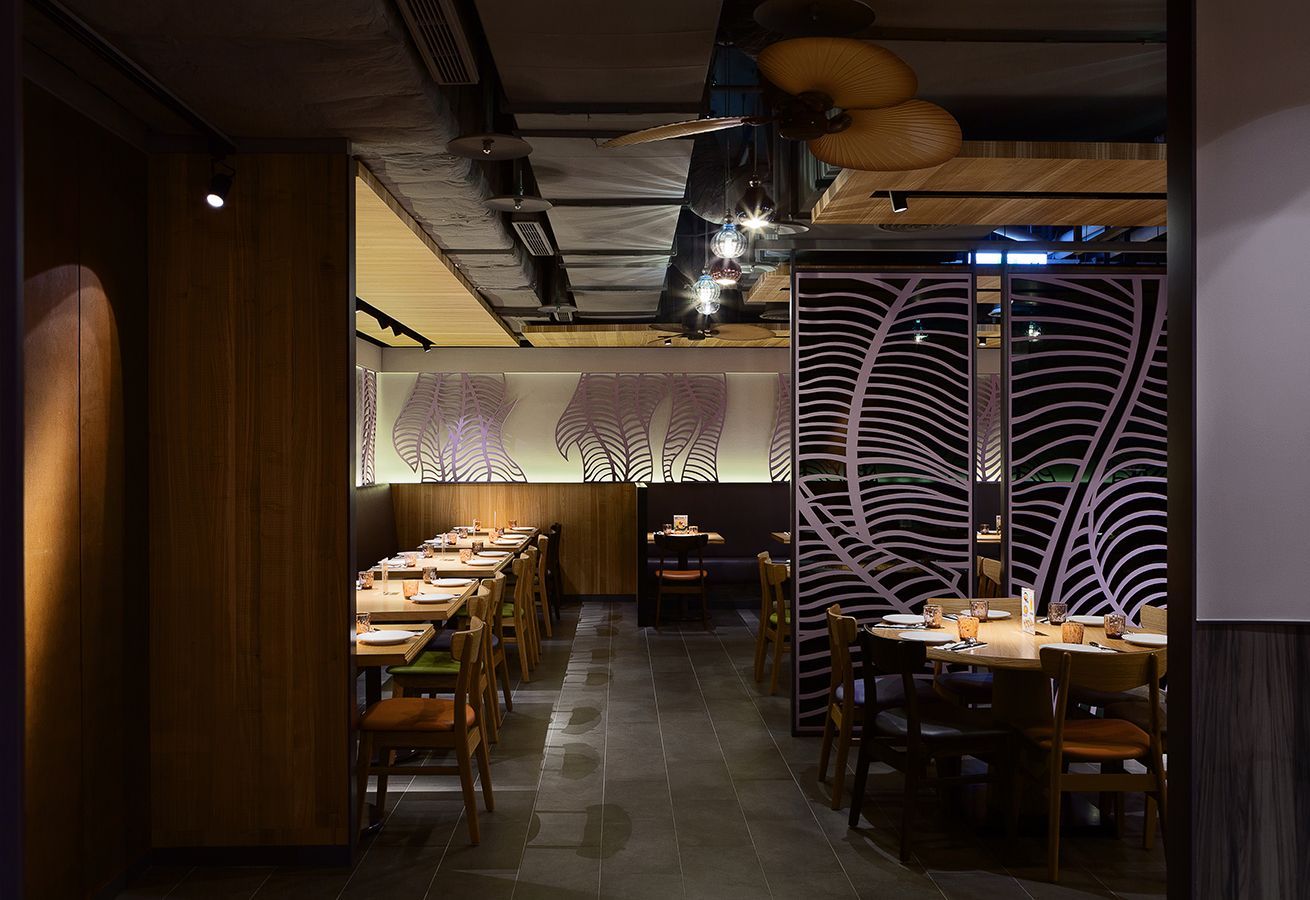 定位上以年輕活潑為主調性,概念來自泰國元素的芭蕉葉,提出了宛若芭蕉林,林內林外用餐的想法。希望這個空間注重隱蔽的同時又不失熱鬧,大膽地讓菜餚重回主角,空間輕鬆低調卻不失光彩。