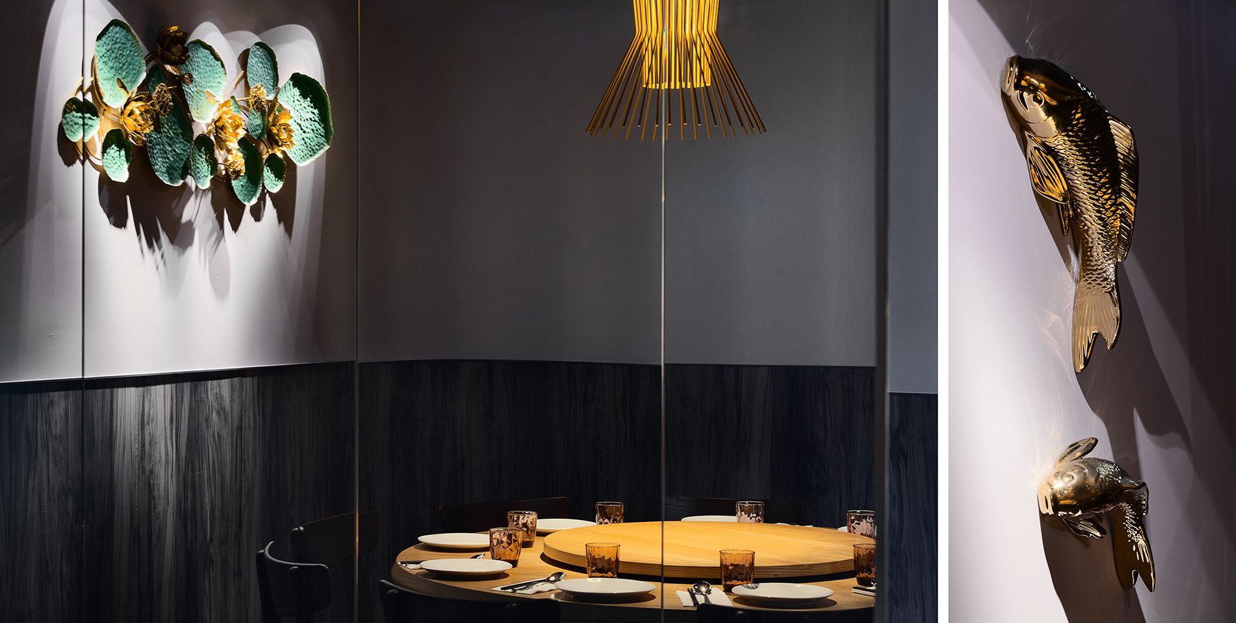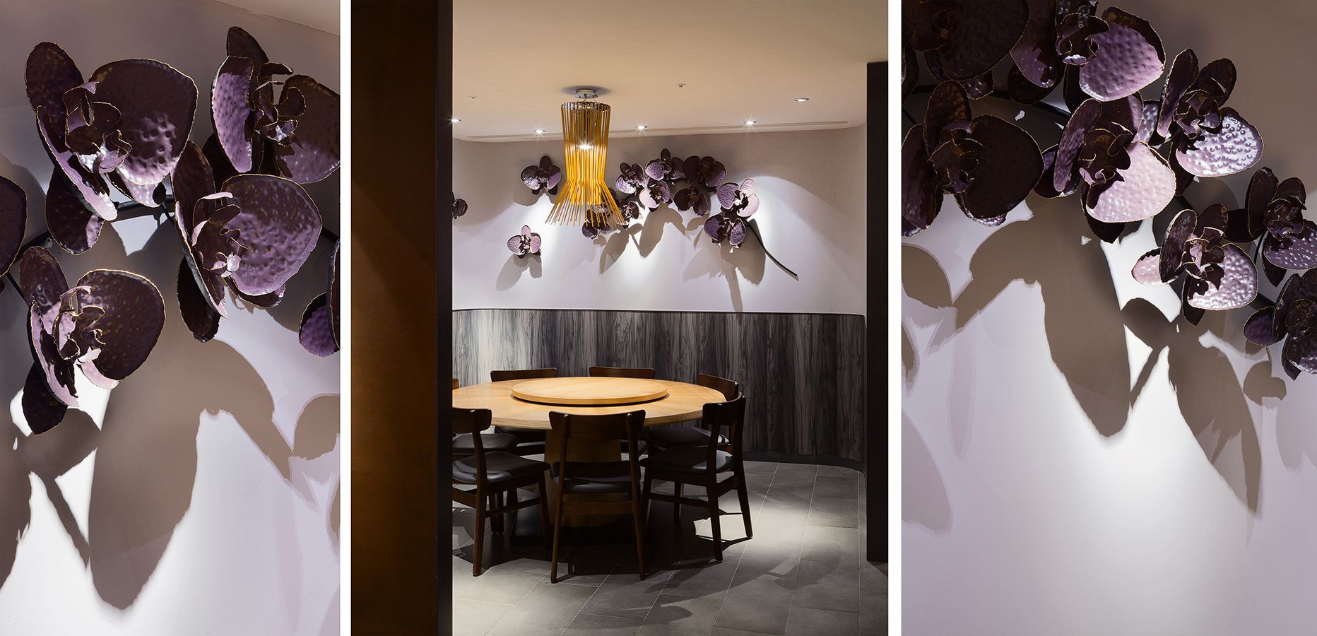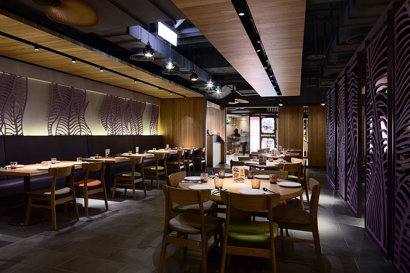 黑玻的深,收邊的醇厚鐵灰,格柵後洗牆的淺灰,露明天花的白灰,窯變紋路的亮灰,卡座的紫灰,堆砌後為之一亮的是格柵的粉紫,帶來溫度的是白栓木紋,於天於壁,突顯回歸桌上,那些紅的白的,綠的澄的艷麗菜色。