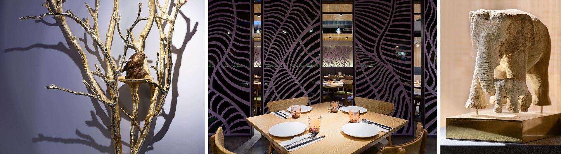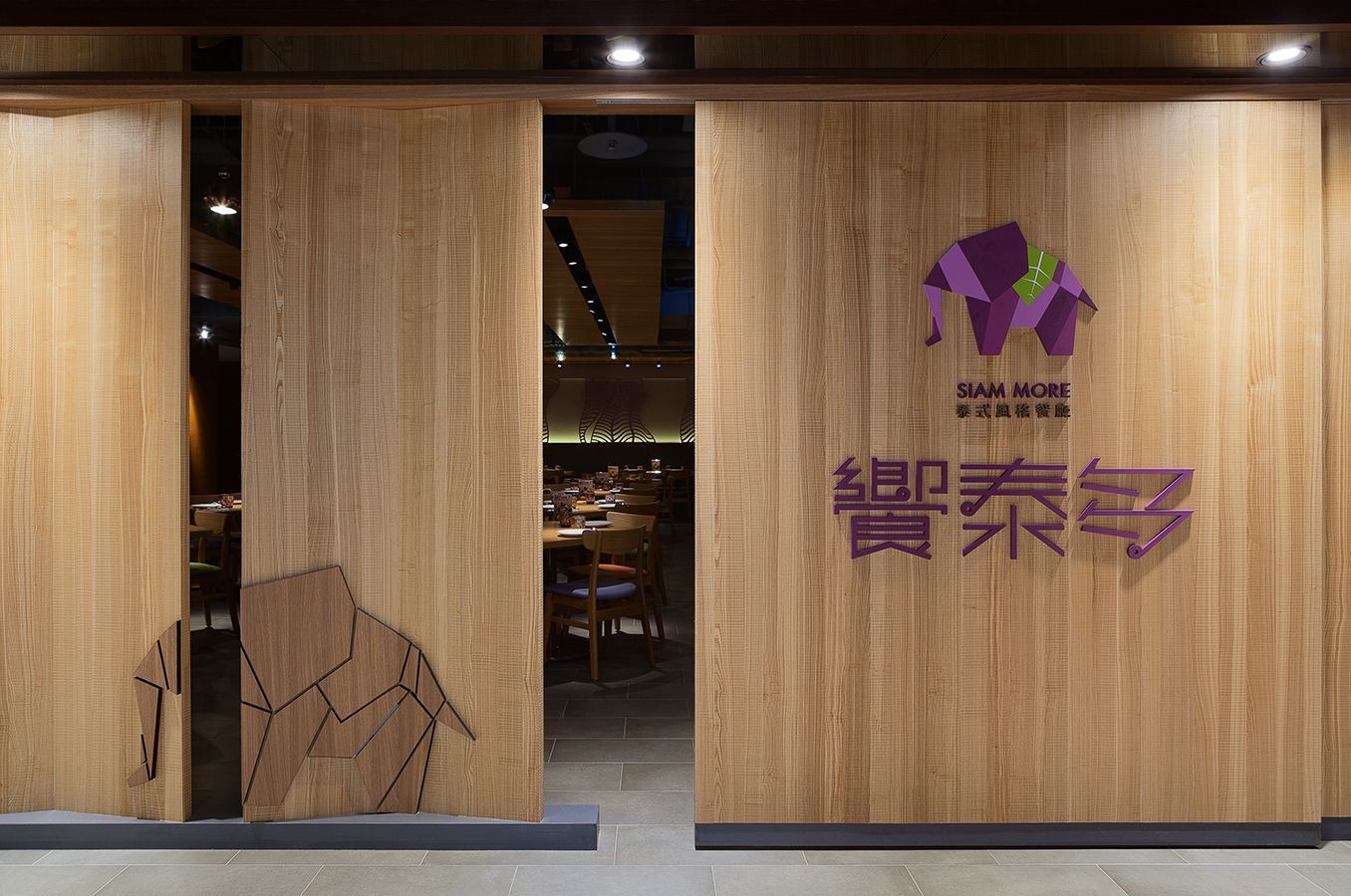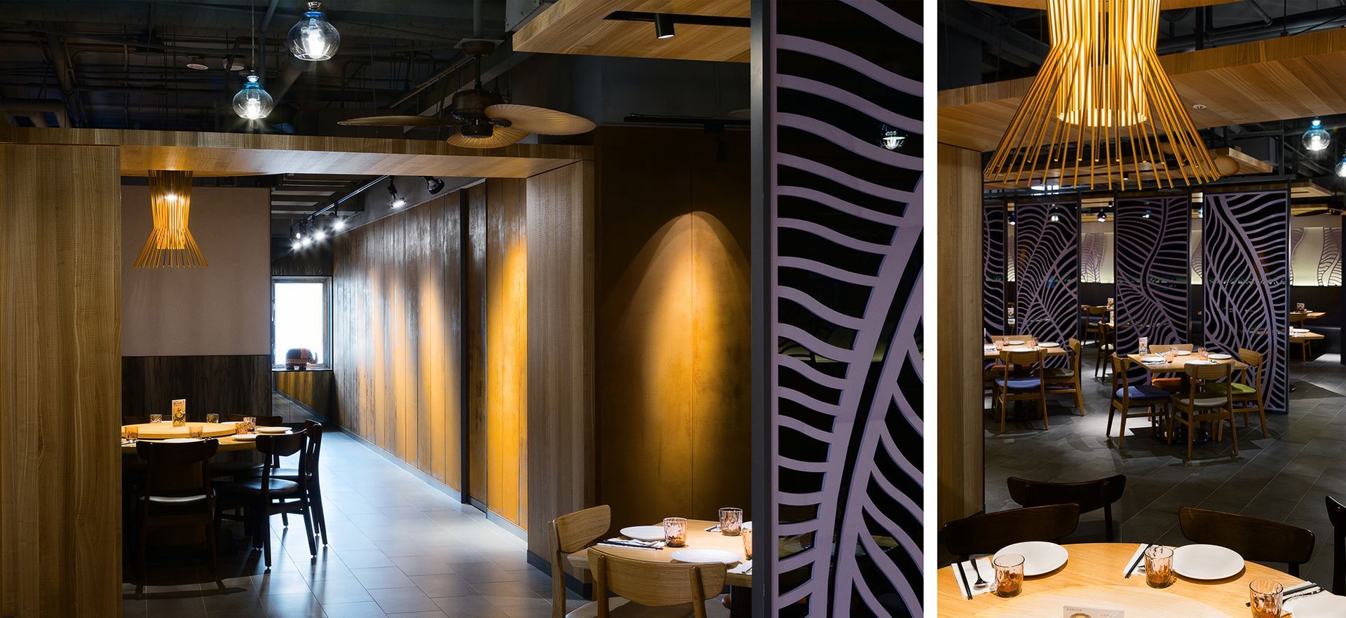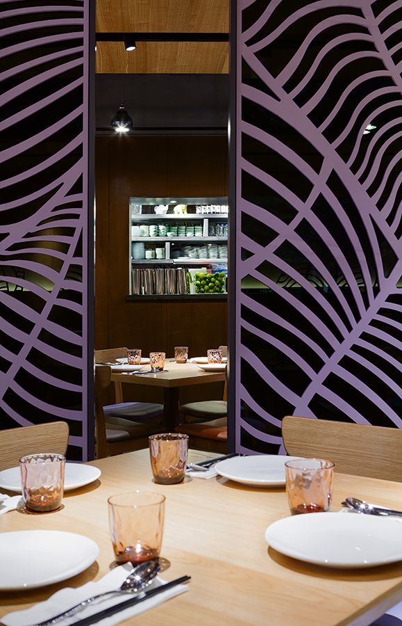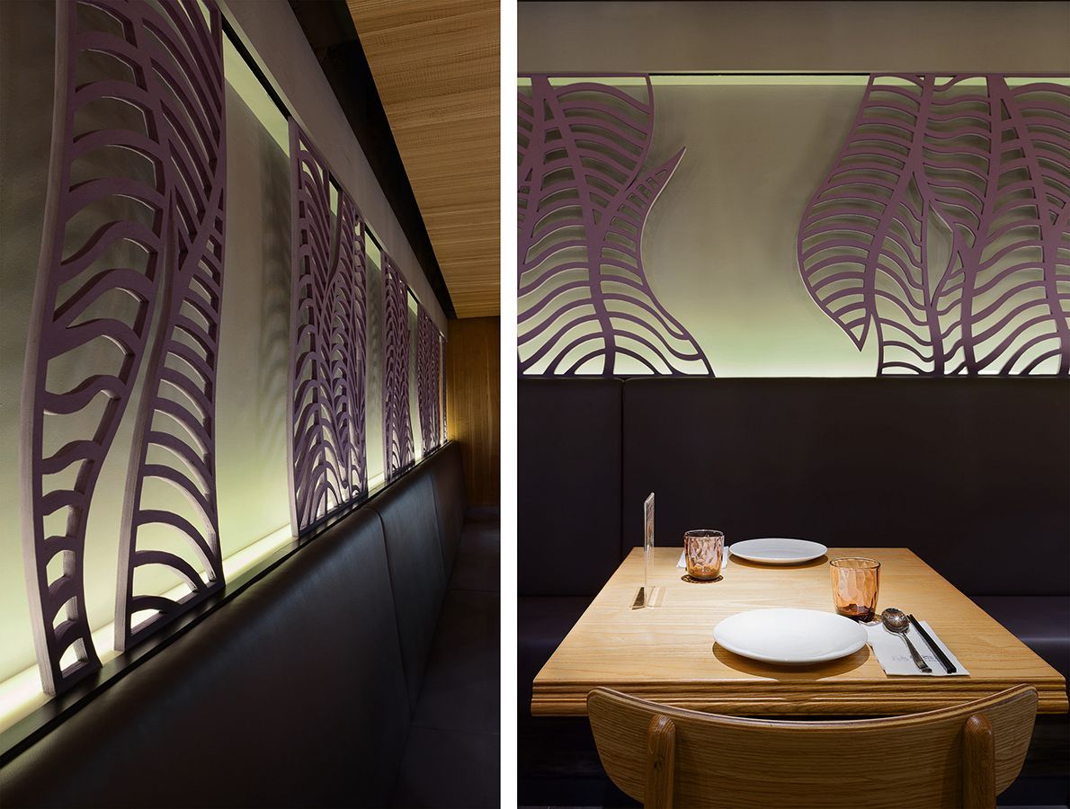 色彩上除卻帶出溫度的白栓木外,其他部分使用各種無彩色低調呈現,襯托出濃厚泰國風味的粉紫色,亦勾勒出料理的鮮豔本色。