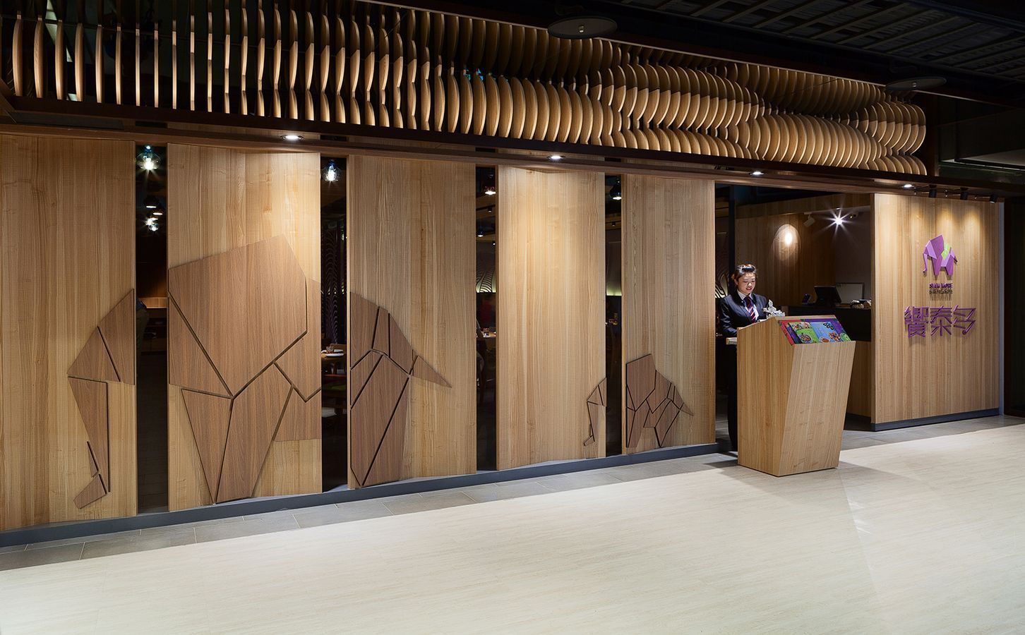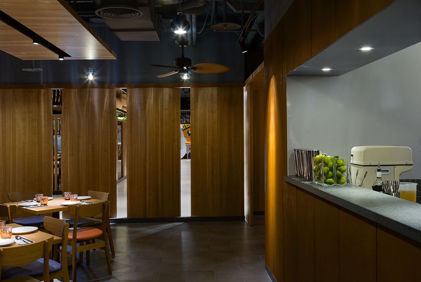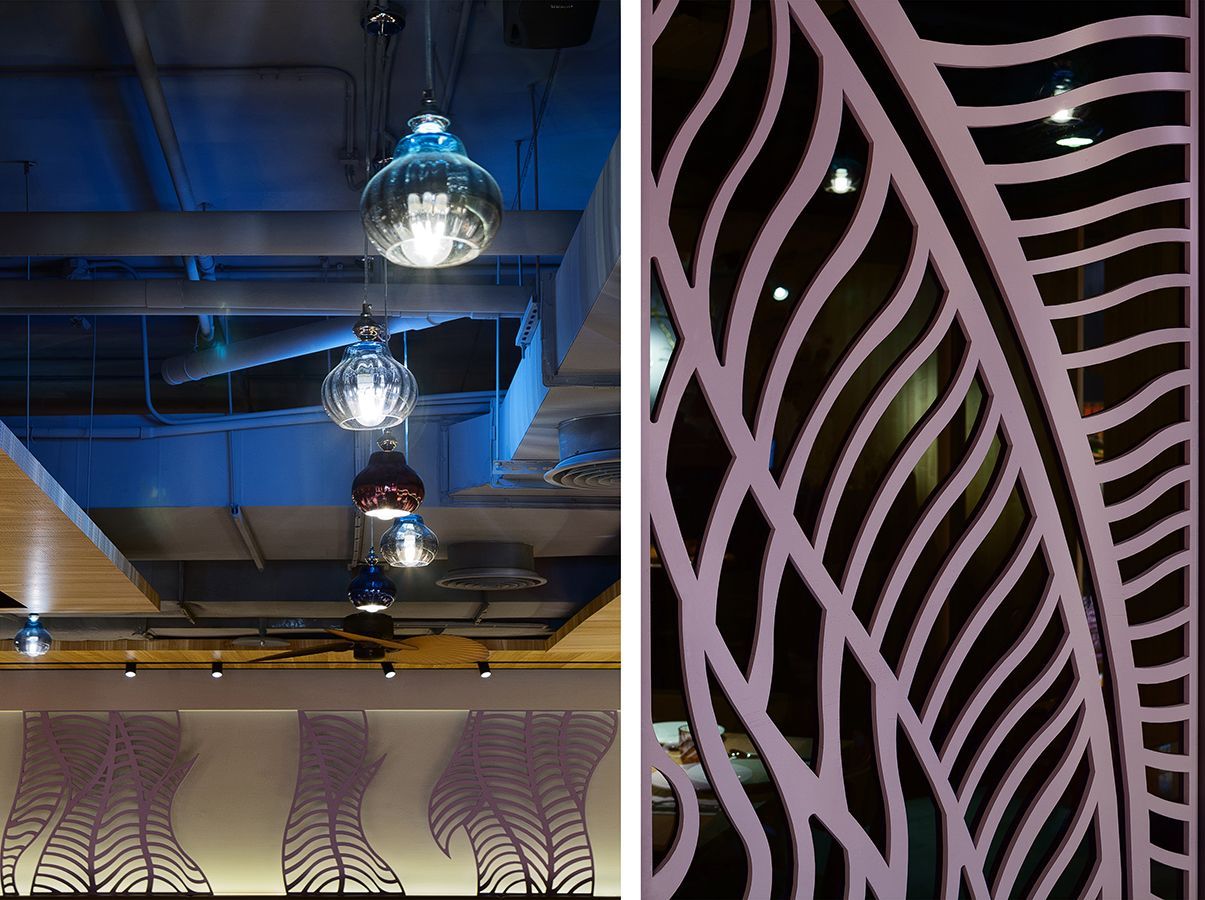 將元素抽象化後的隔屏作為視覺重心,視覺焦點並非以投射燈強調,而是著重在反光和穿透的同時進行所造成的效果:明亮的周圍格柵由洗牆滲出反光,以及另一側穿透黑玻格柵的光線,加上本身格柵的紋路,創造了明暗乍現的芭蕉叢林內外互望的氛圍。