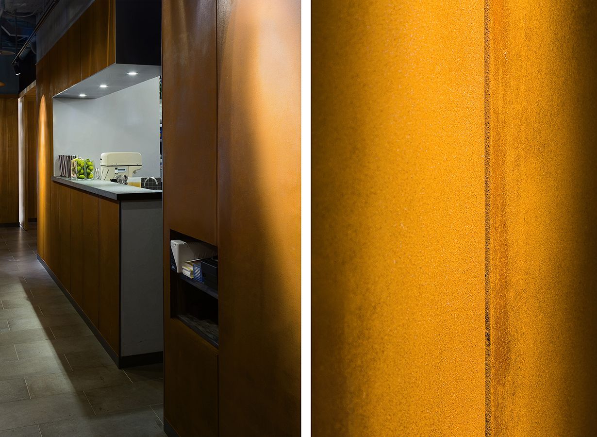 • 主要建材:黑色玻璃、白栓木皮、鏽化漆、烤漆鐵件、霧面石英磚