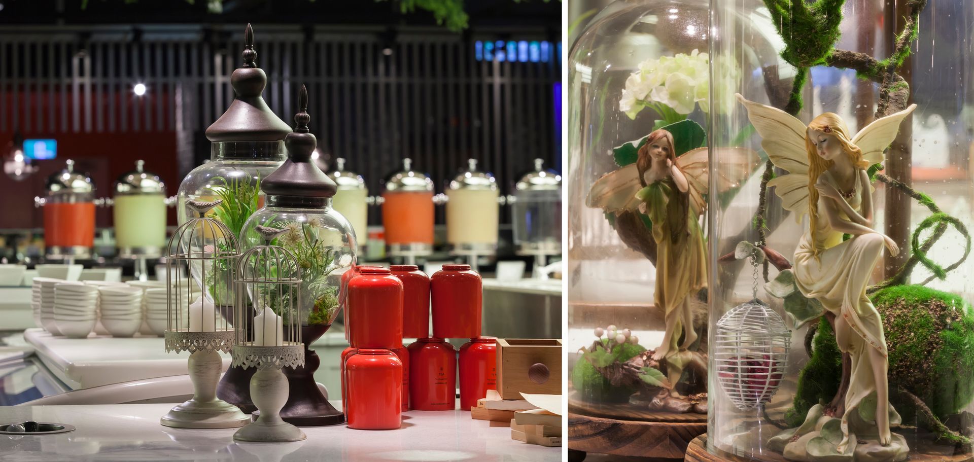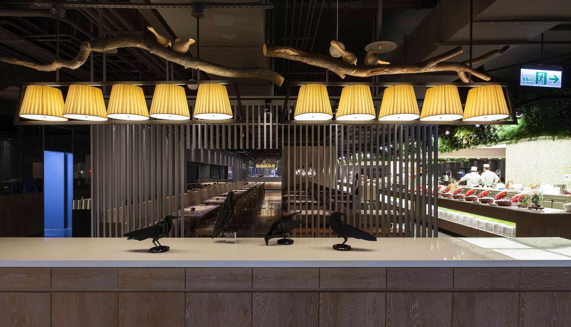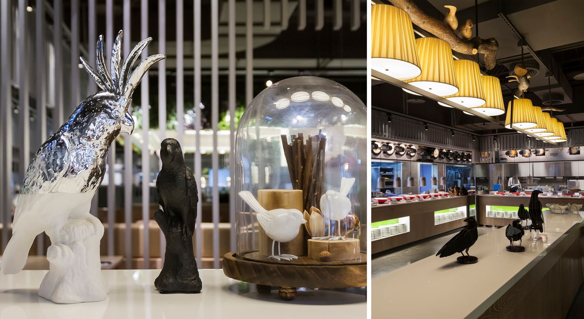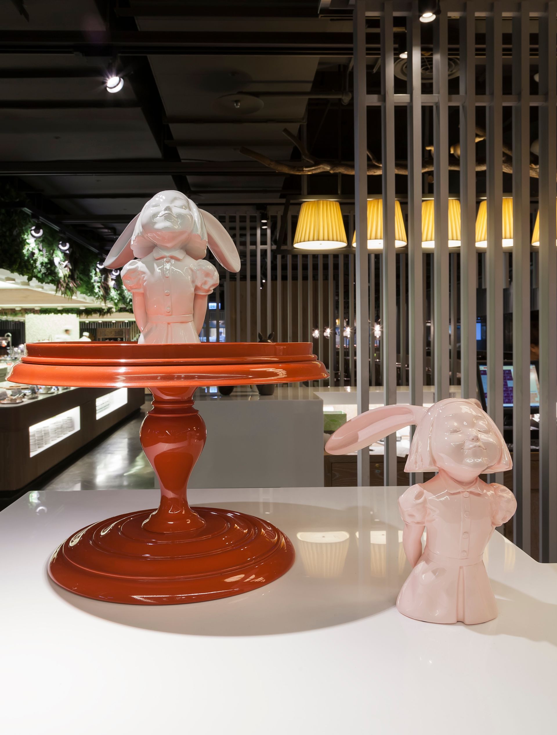 入口處兩隻擬人化的兔子姑娘微微揚起臉,彷彿正在體驗微風吹拂過臉及經過髮絲的涼快,進入餐廳,迎面而來的是可愛的瓶中精靈,帶領您進入他們的世界,散落在餐檯各處的動物們正在告訴您慢下腳步,一起享受這兒悠閒的時光,牆面上的金魚像是吃飽後在散步,悠閒地輕輕地遊在池塘中,如此滿足。